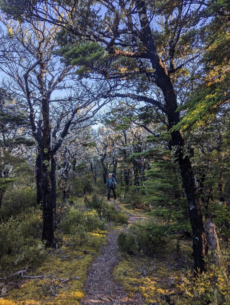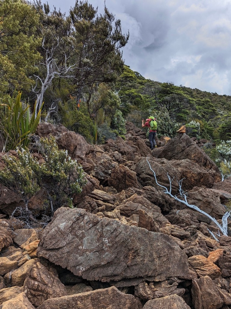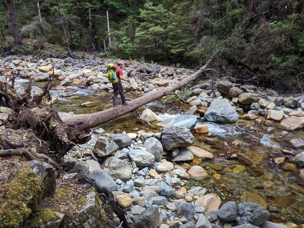 Après une brève montée, le chemin qu’on suit descend presque en chute libre sur Mid Wairoa Hut. Nos genoux en prennent pour leur grade tellement c’est raide ! On est bien content que le chemin soit sec car, déjà dans ces bonnes conditions, il est pas évident alors en plus avec le sol boueux, ça doit être infernal.