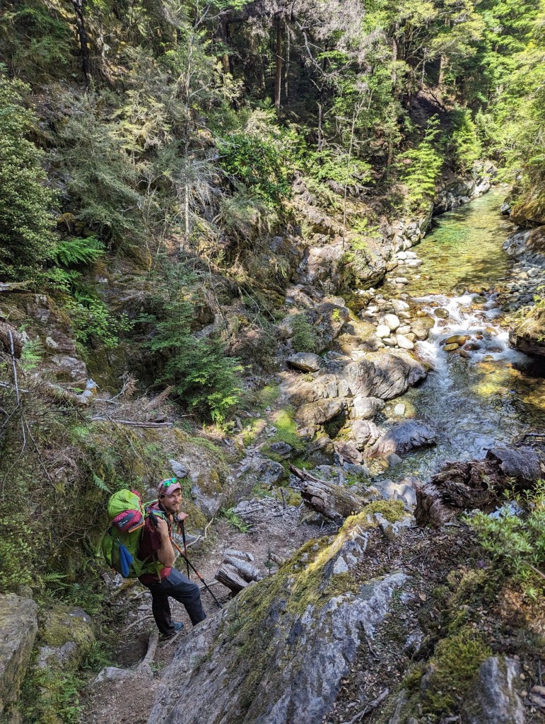 After a short climb, the path we are following descends almost in free fall on Mid Wairoa Hut. Our poor knees ! We are very happy that the path is dry because already in these good conditions it is not easy so when it’s muddy, it must be hell.