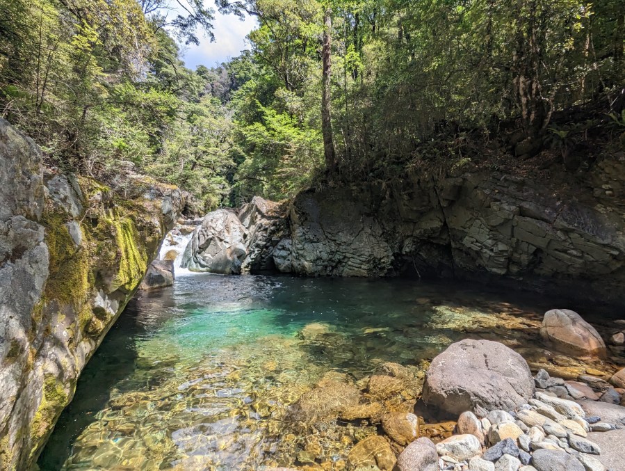 À cause de ce chemin ultra raide, on arrive un peu plus de deux heures plus tard à la hut. Elle se trouve dans un lieu magnifique au fond d’une vallée escarpée avec une rivière passant juste à côté. On en profite pour remplir nos gourdes car notre précédent logement était à sec.