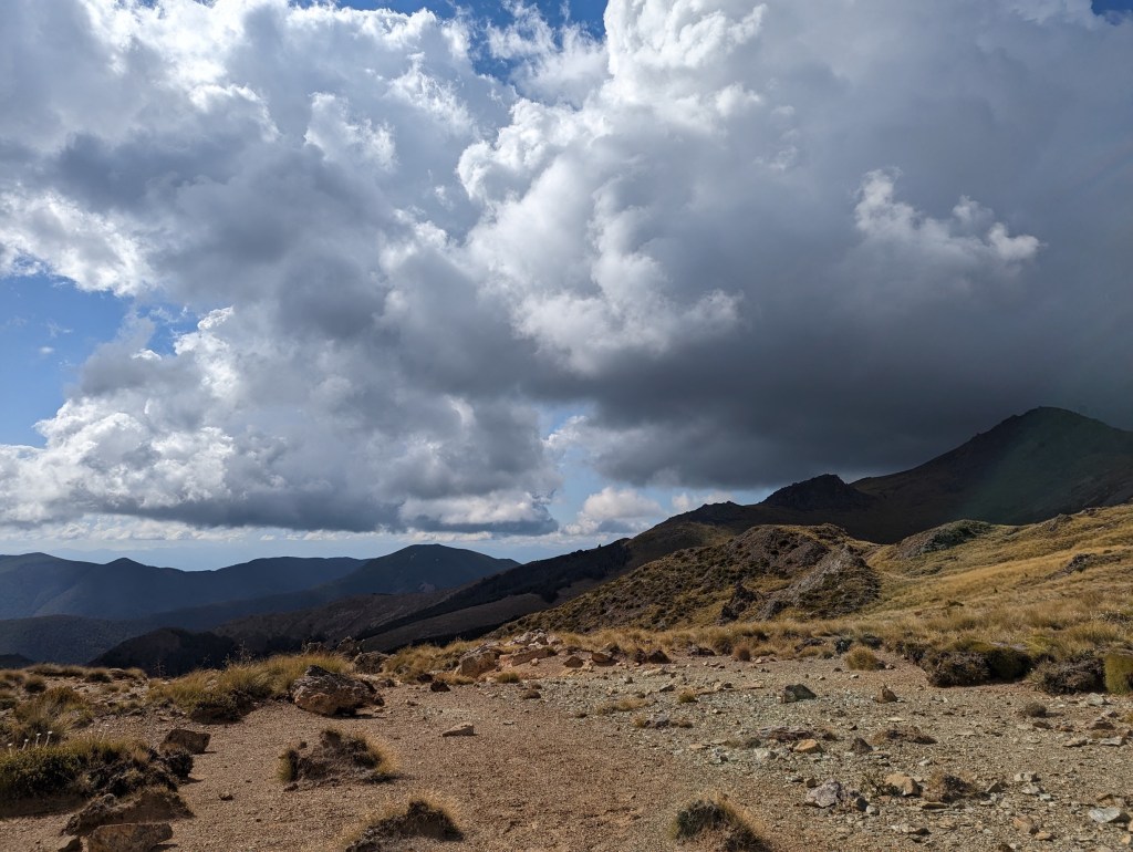 It takes us about 1 hour to cover the 2.2km climb to the pass. We are a little desperate because the route on our map tells us that we still have to climb 350m to the top of Mt. Ellis before descending on the other side. But it’s not very clear because comments say that the road actually passes at the foot of the mountain. Fortunately, we can see silhouettes of hikers in the distance. We decide to take a break while waiting for them to ask them where the path is for real.
