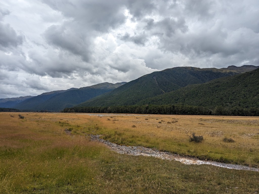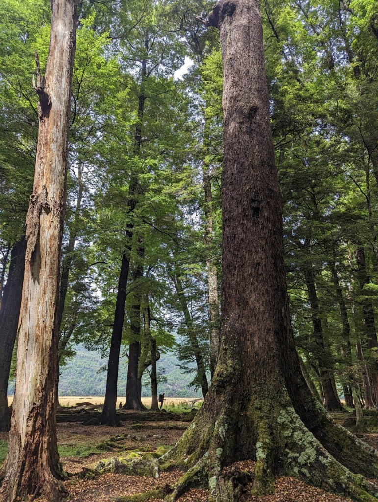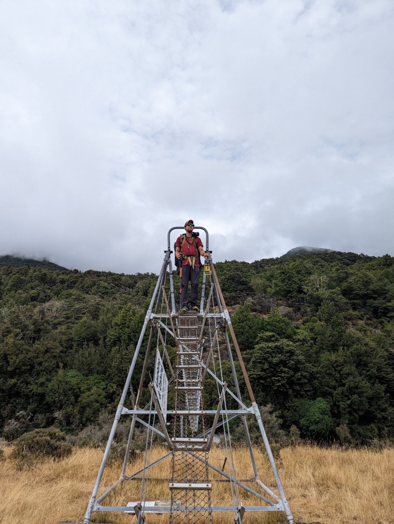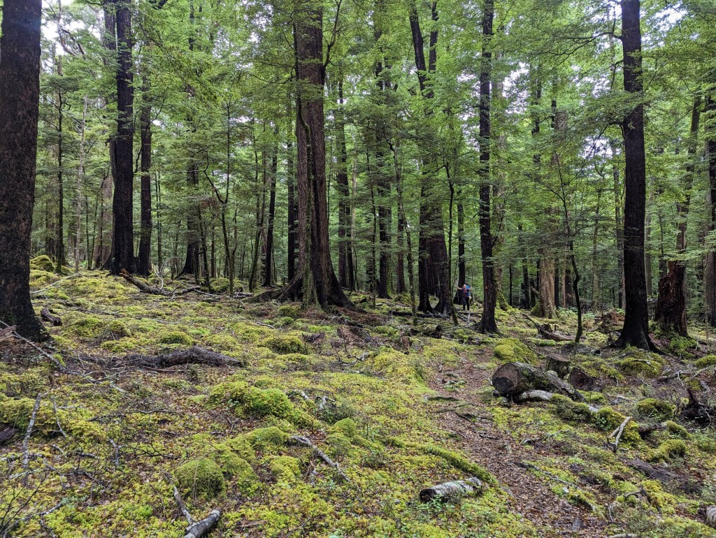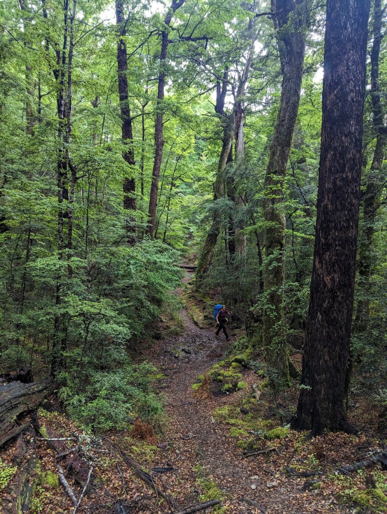 Un pont à fort rebondit nous permet ensuite de traverser une large rivière pour retourner sous le couvert de la forêt. Un chemin bien large nous mène alors jusqu’à la première hut du jour – Hurunui Hut – pile à l’heure du lunch.