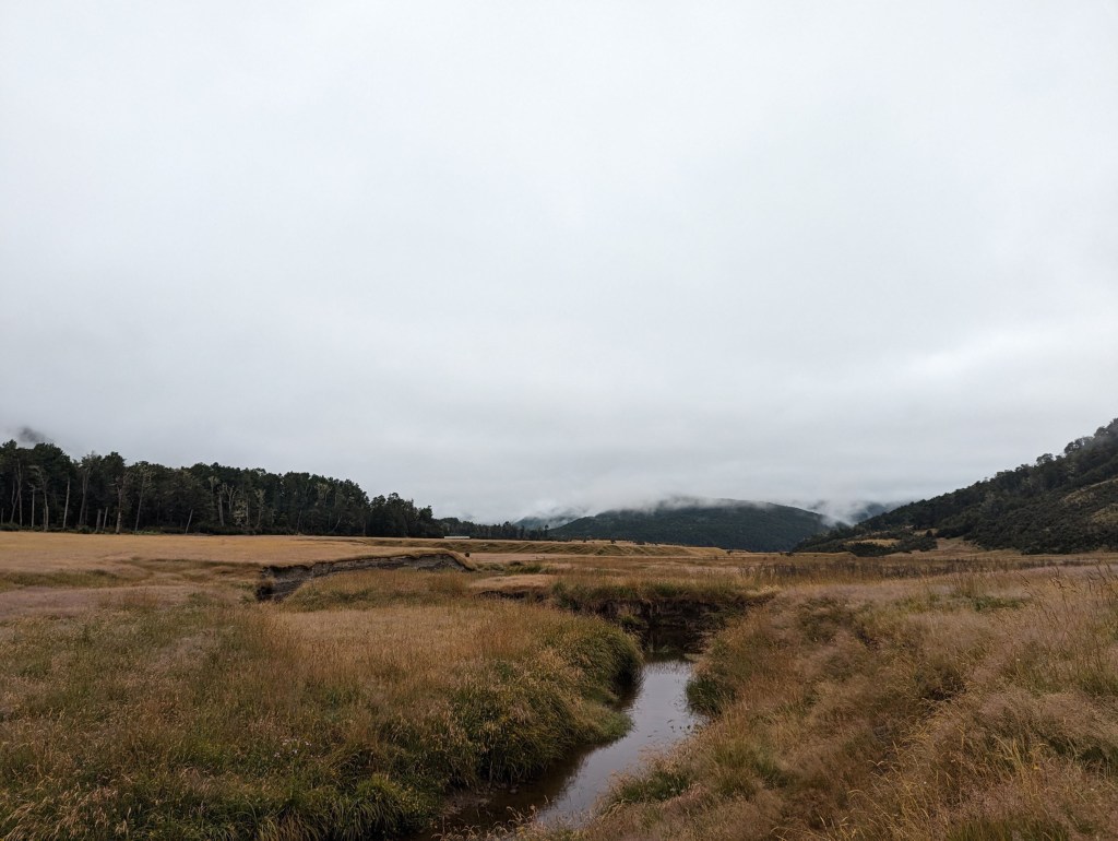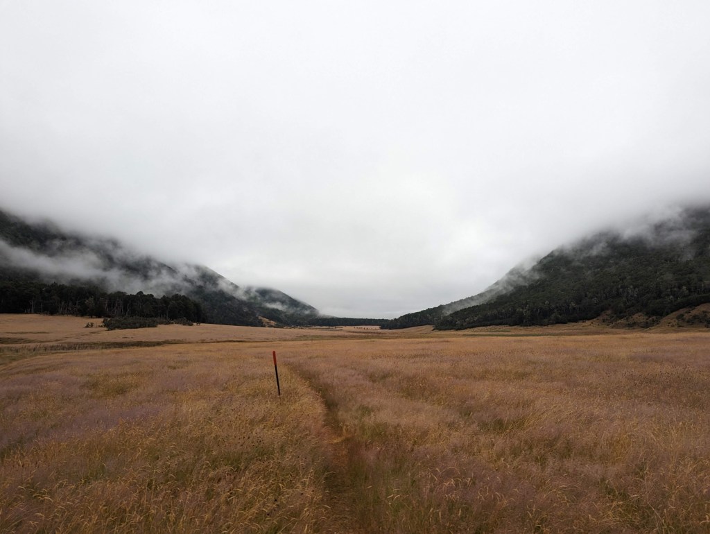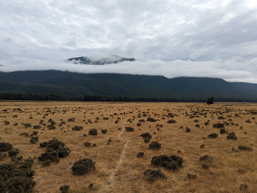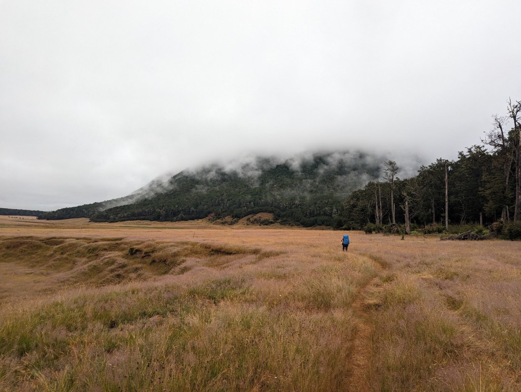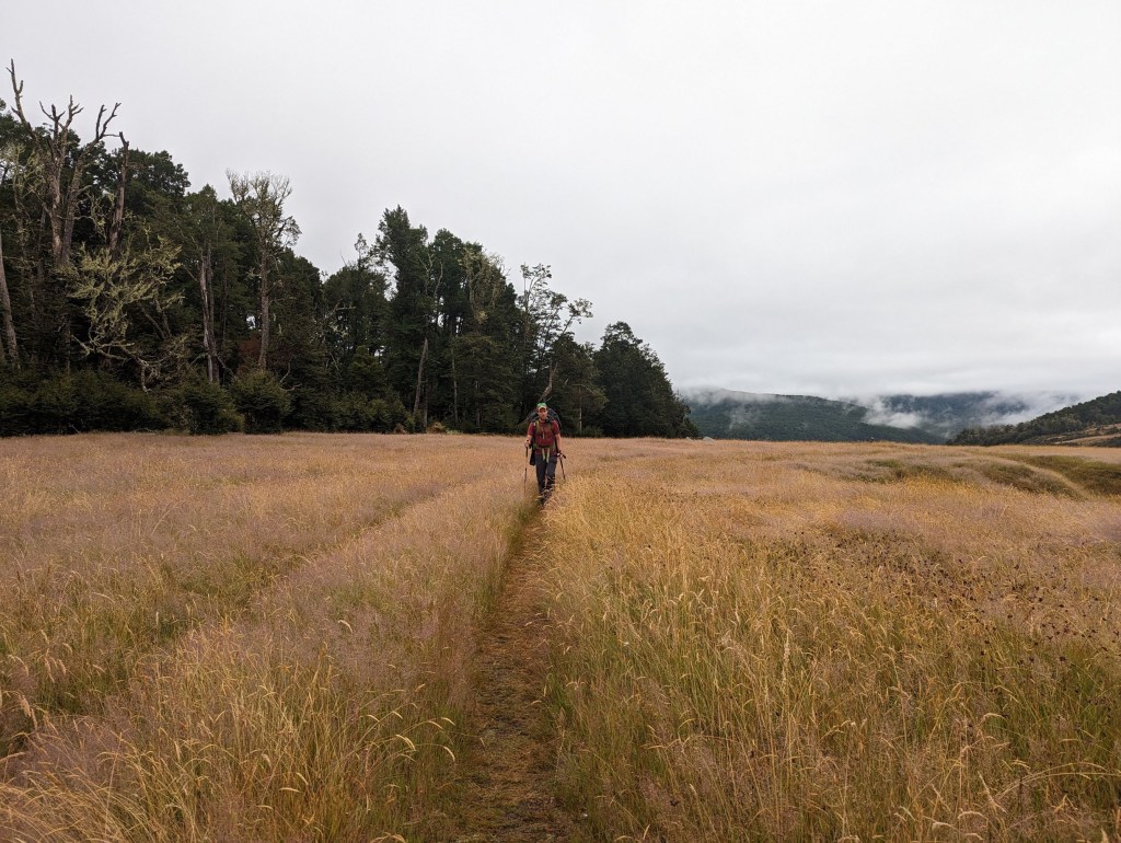 Après un bon bout dans des hautes herbes à se détremper les pantalons jusqu’aux genoux, on entre finalement dans une forêt. Là, on grimpe un petit peu jusqu’à un petit col avant de redescendre tranquillement vers une autre plaine de hautes herbes.