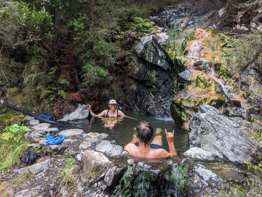 Il nous faut à peu près une heure pour y arriver. On a déjà très chaud alors on décide de d’abord sauter dans la rivière principale très fraîche avant d’aller profiter de la hot pool. C’est un tout petit bassin un peu amélioré par main d’homme et très vaseux. Mais l’eau est à une température absolument parfaite, probablement entre 30 et 35 degrés. On y reste une trentaine de minutes en compagnie de Roxann avant de replonger dans la rivière froide. Ça fait le plus grand bien. Mais on ne peut pas trop trainer car nous sommes très vite harassés par une nuée de sandflies…