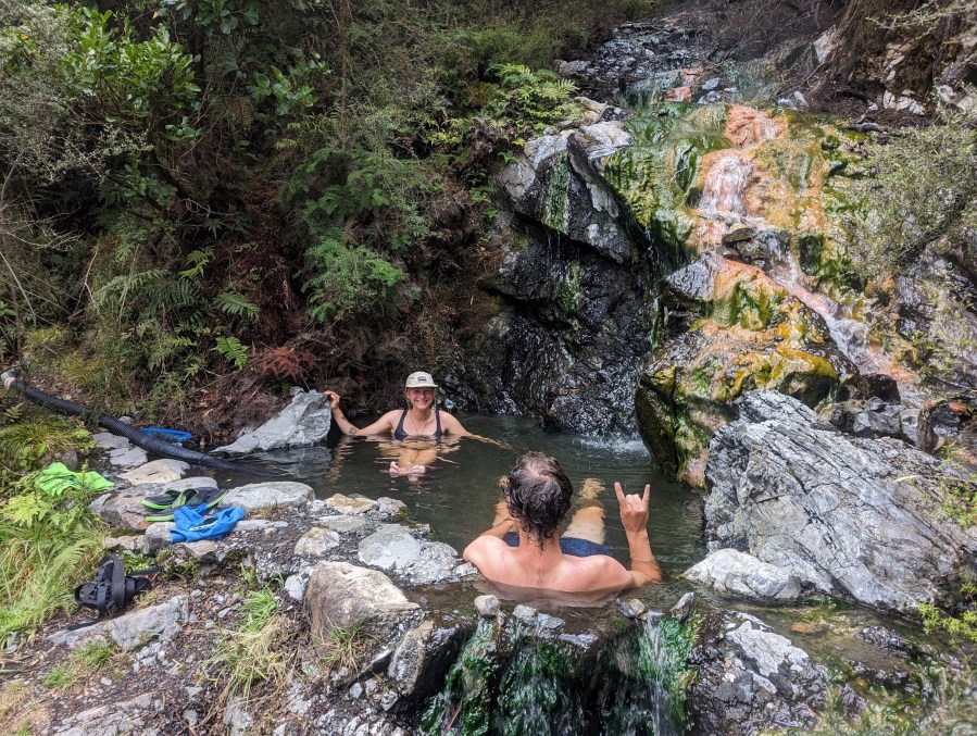 Finalement, vers 13:30 on se lance dans les 10 derniers kilomètres du jour. Mais surtout, à mi-chemin, il y a une hot pool naturelle dans laquelle on a l’intention de faire trempette.