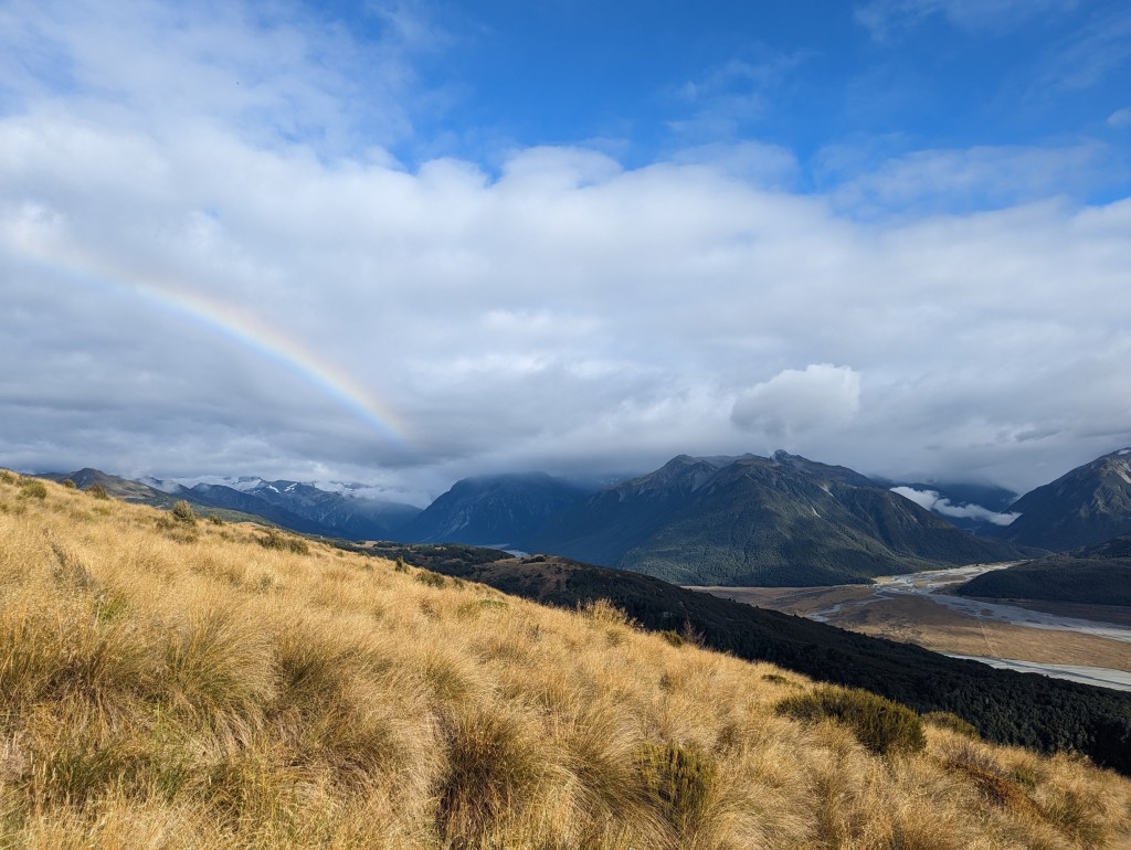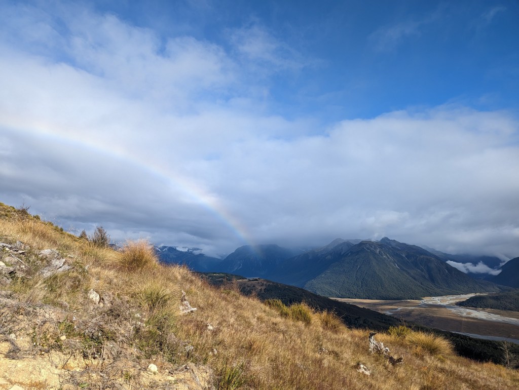 Après avoir traversé une forêt, notre sentier longe le flanc d’une montagne de laquelle nous pouvons apercevoir, au loin, au fond d’une vallée, Arthur’s Pass qui se fait rincer par la pluie. C’est fou la différence qu’il peut y avoir d’une vallée à l’autre. On aperçoit également un magnifique arc-en-ciel pas très loin au dessus de montagnes environnantes.