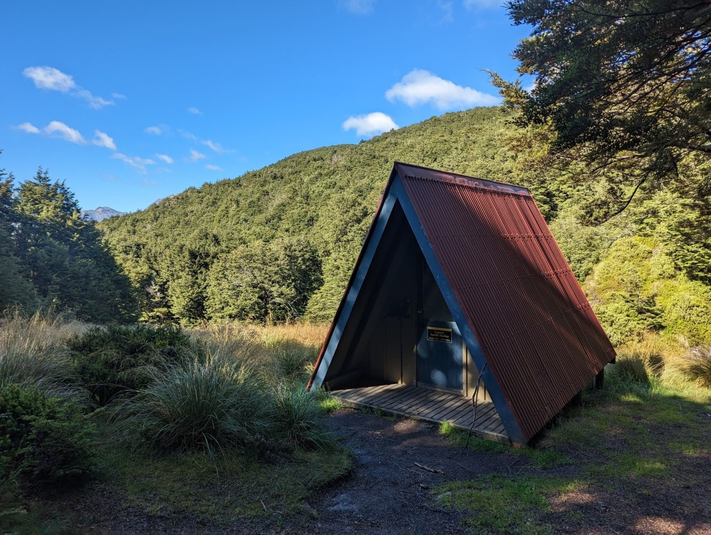 Vers 14:20 nous arrivons finalement à Hamilton Hut pour une brève pause et une rapide discussion sur la suite du programme. On hésite à rester sur place ou pousser encore quelques kilomètres plus loin vers un coin à camping sauvage recommandé dans des commentaires. On hésite bien quelques minutes car la hut est fabuleuse, récemment rénovée et très spacieuse.