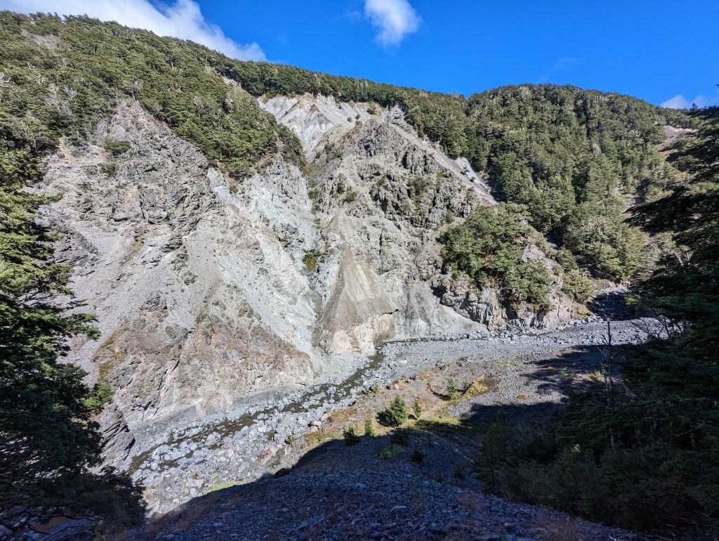 Une fois le Lagoon Pass passé, nous entamons une descente régulière dans une vallée en suivant de près une rivière. Il nous est fréquemment nécessaire de marcher dans son lit. Heureusement, son niveau est assez bas, ce qui nous évite d’avoir à mouiller nos pieds. Une grande victoire compte tenu des derniers jours 😁