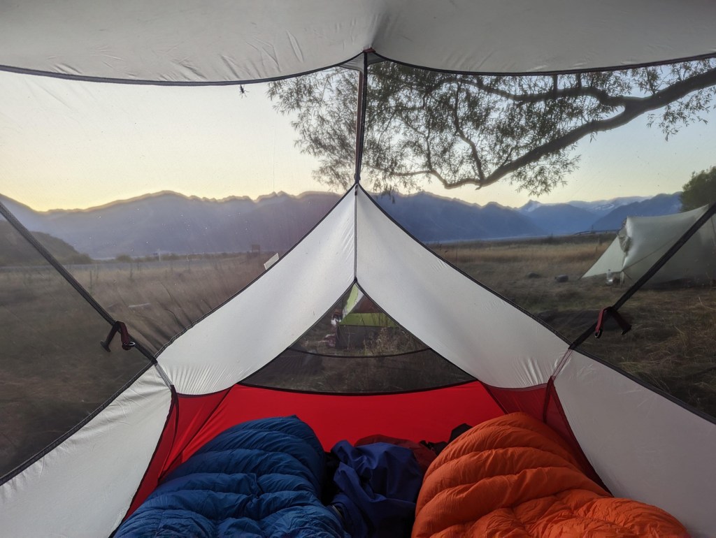 Vers 20:15, alors que le soleil est sur le point de se coucher derniĆØre les montagnes, on voit un van se parquer pas trĆØs loin de l’autre cĆ“tĆ© du parking. Fleur va causer un moment avec le couple qui en sort et je les rejoins un les aprĆØs par curiositĆ©. C’est lĆ que Fleur m’annonce fiĆØrement que le couple (des hollandais) sont ok pour nous prendre les 4 avec eux demain matin directement jusqu’Ć Geraldine š¤Æ. On peut toujours compter sur Fleur pour nous dĆ©goter du stop facile hahaha