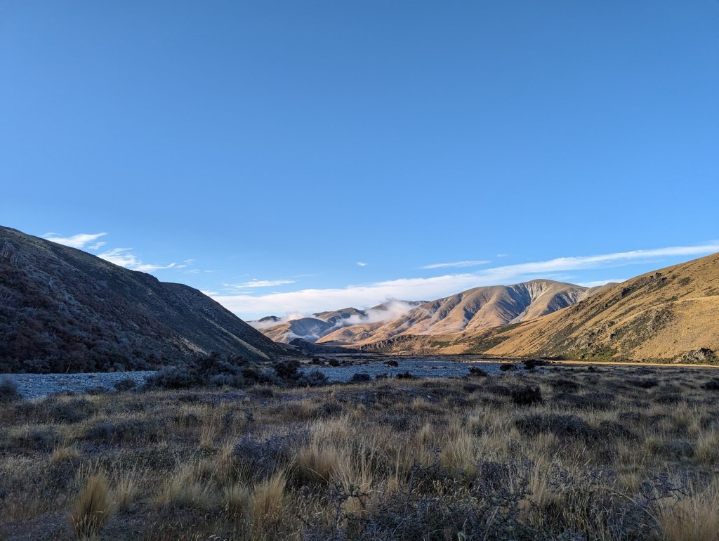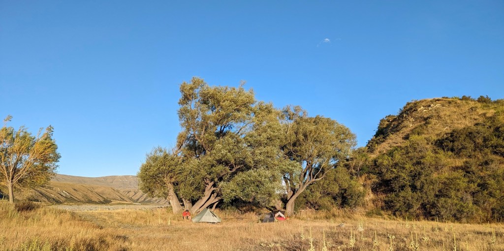 Ć 17:50, on arrive enfin au bout du sentier au bord de la Rangitata River. RiviĆØre officiellement considĆ©rĆ© comme infranchissable mais qu’il reste possible de traverser avec de bonnes conditions. Malheureusement pour nous, il a plu plus haut dans les montagnes ces derniers jours et le courant est trop Ć©levĆ© pour tenter un passage.