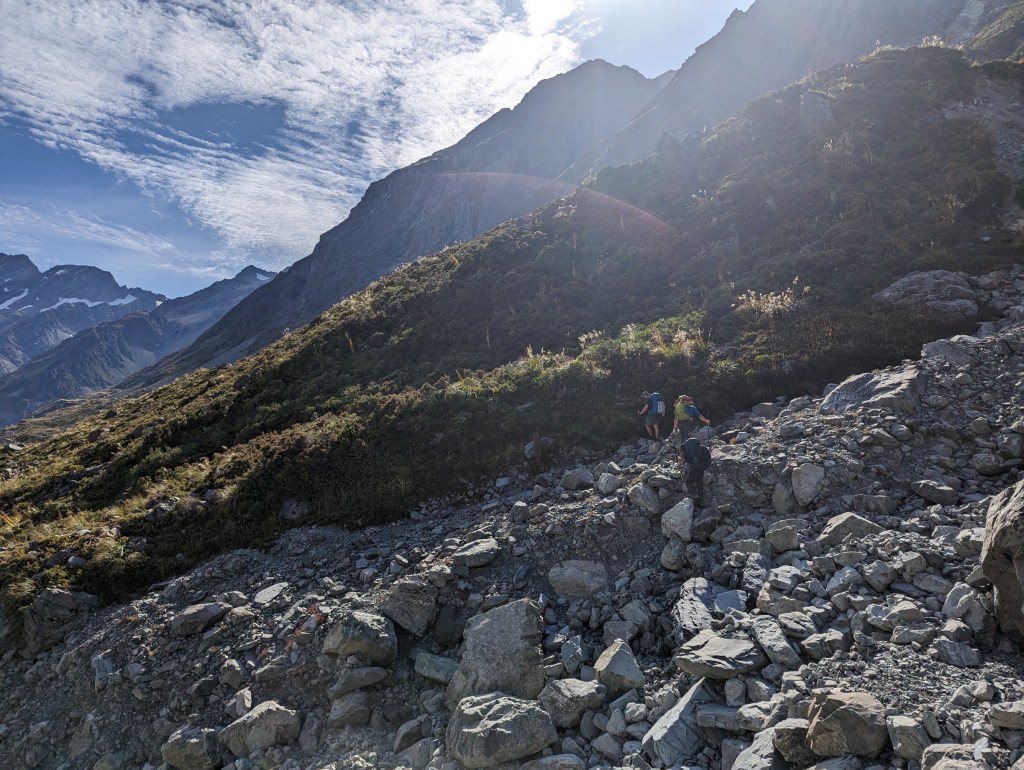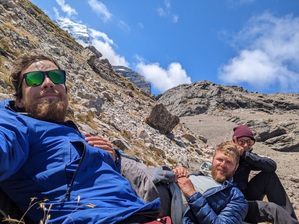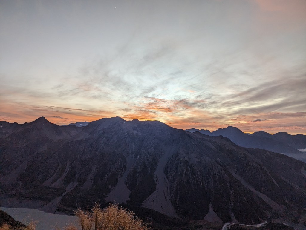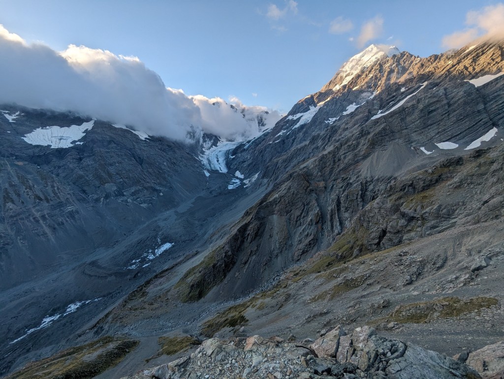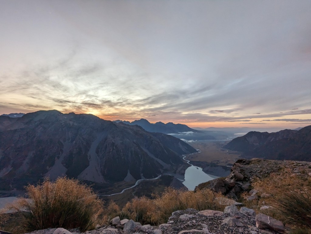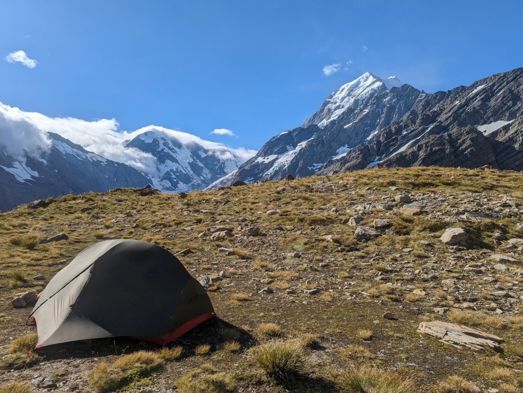 Au final, bien que particulièrement raide, ce bout était probablement le plus facile et fun a parcourir. On arrive finalement vers 15:50 au lieu de bivouac. Ça valait bien la peine car le temps est toujours parfait avec quasiment pas de vent et nous sommes très proche du Mt. Cook. On en profite alors pour faire la sieste pendant deux heures au soleil. D’autant plus qu’il n’y a pas de sandflies ici ! Le rêve !