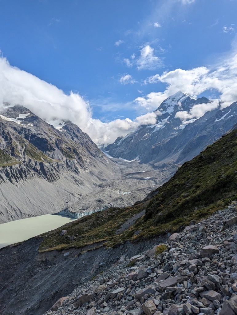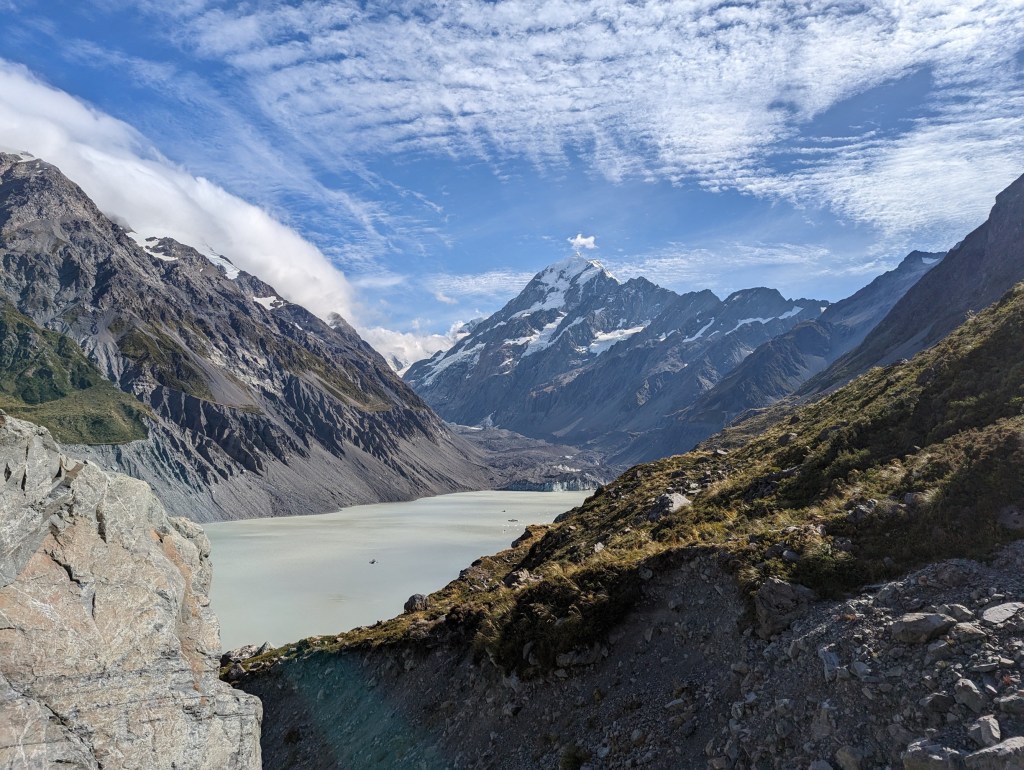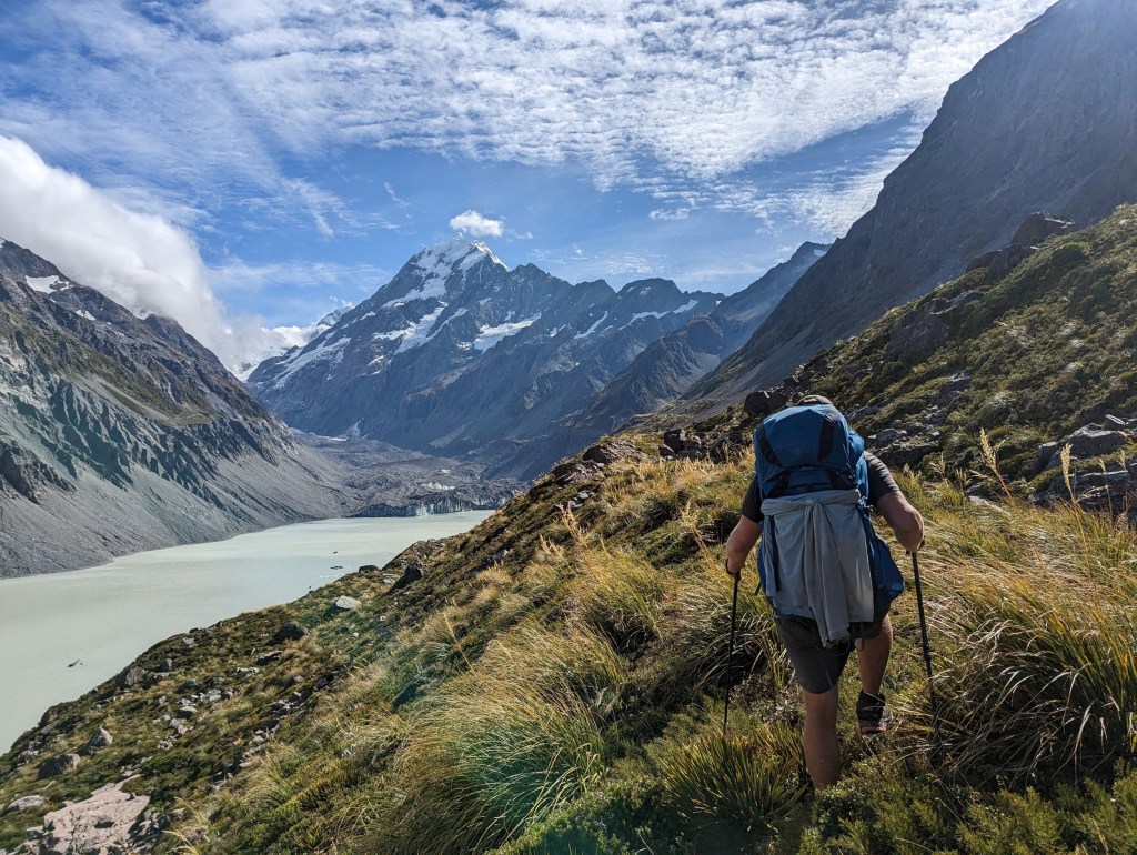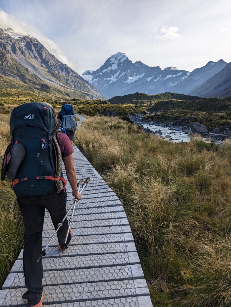 On quitte le bivvy à 8:15 avec Gijs et notre nouvel acolyte, Ben, qui se joint à nous pour le Ball Pass. La descente se fait rapidement aux dépens de nos genoux qui en prennent à nouveau pour leur grade. En tout, la descente ne nous prend qu’une heure et nous arrivons ainsi vers 9:15 au petit chemin touristique menant du parking au Hooker Lake d’où tous les touristes vont prendre leurs photos de Aoraki/Mt. Cook.