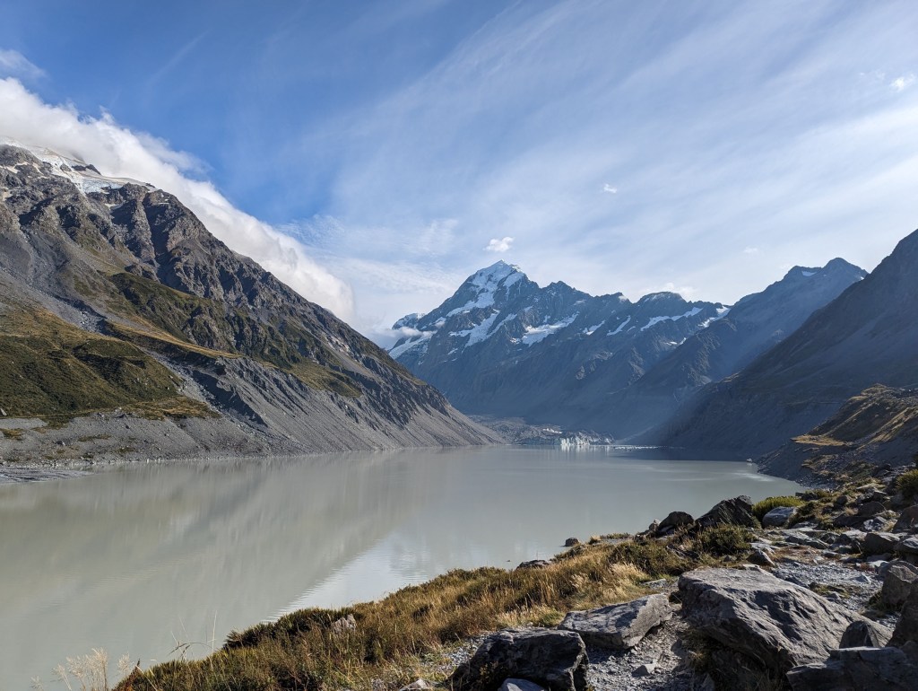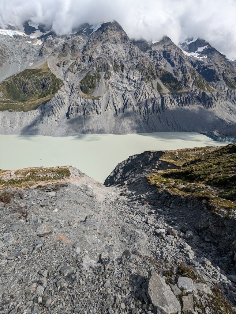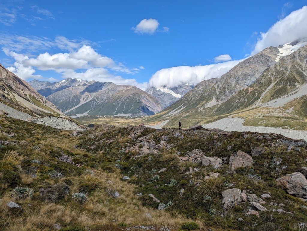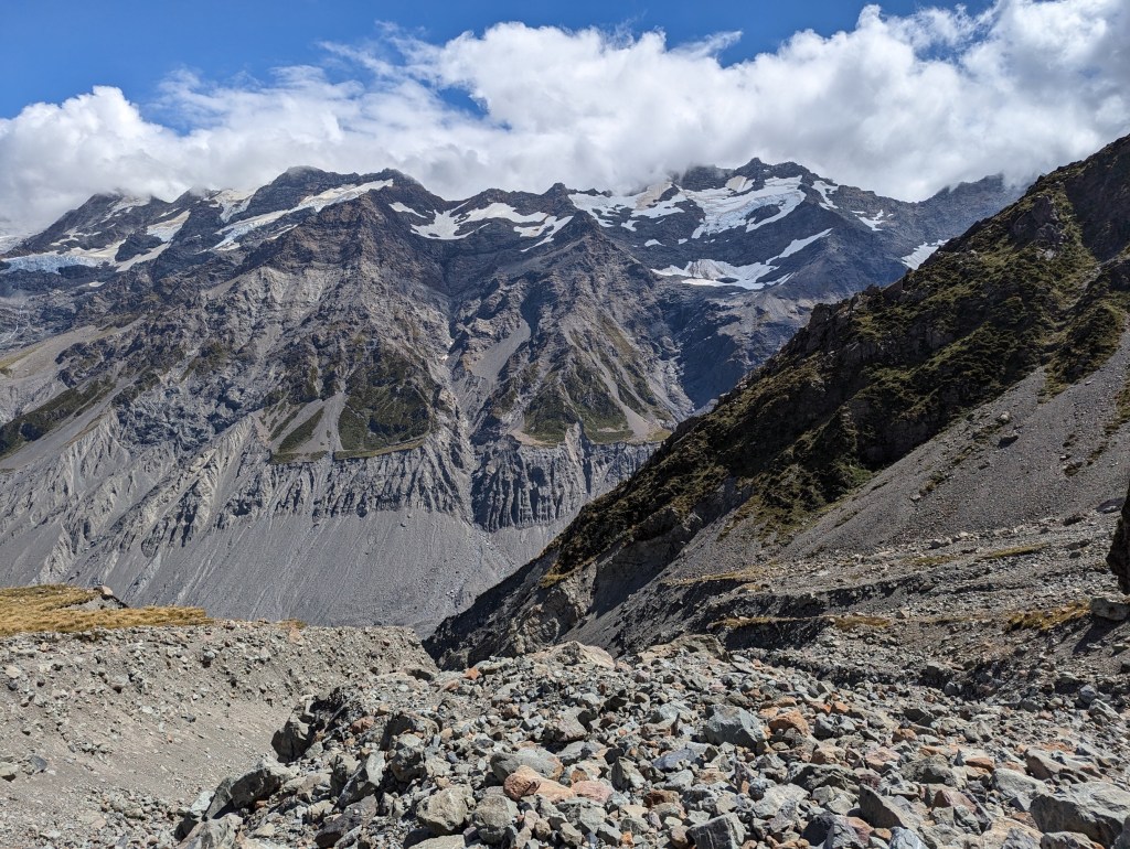 On quitte le bivvy à 8:15 avec Gijs et notre nouvel acolyte, Ben, qui se joint à nous pour le Ball Pass. La descente se fait rapidement aux dépens de nos genoux qui en prennent à nouveau pour leur grade. En tout, la descente ne nous prend qu’une heure et nous arrivons ainsi vers 9:15 au petit chemin touristique menant du parking au Hooker Lake d’où tous les touristes vont prendre leurs photos de Aoraki/Mt. Cook.