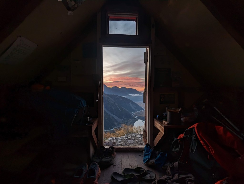 In the end, although particularly steep, this section was probably the easiest and most fun to navigate. We finally arrive at around 3:50 p.m. at the bivouac site. It was well worth it as the weather is still perfect with almost no wind and we are very close to Mt. Cook. We then take the opportunity to take a nap for two hours in the sun. Especially since there are no sandflies here! The dream !