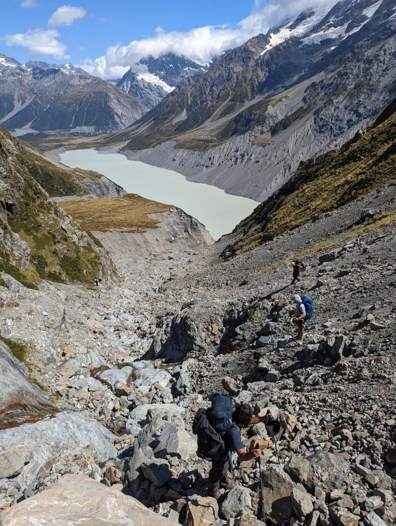 We leave the bivvy at 8:15 with Gijs and our new hiking partner, Ben, who joins us for the Ball Pass. The descent is done quickly at the expense of our knees which again take a beating. In total, the descent only takes us an hour and we arrive at around 9:15 at the small tourist path leading from the parking lot to Hooker Lake from where all the tourists go to take their photos of Aoraki/Mt. Cook.