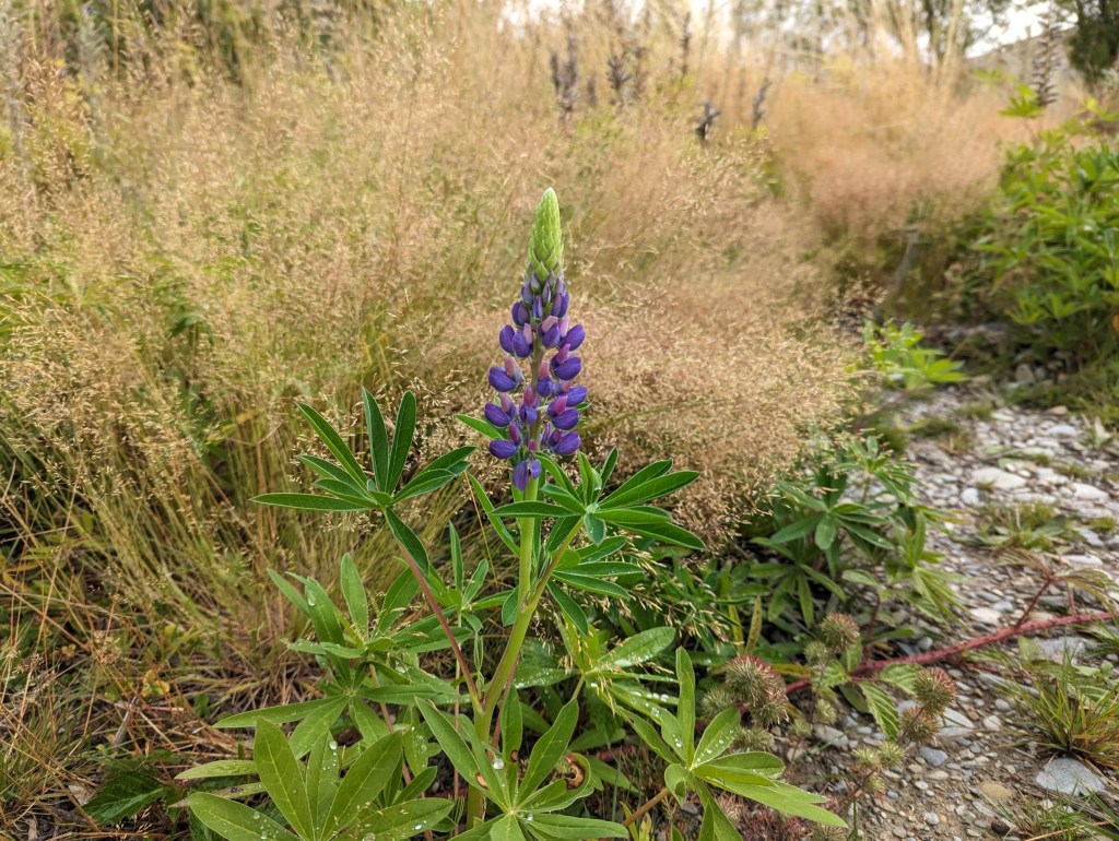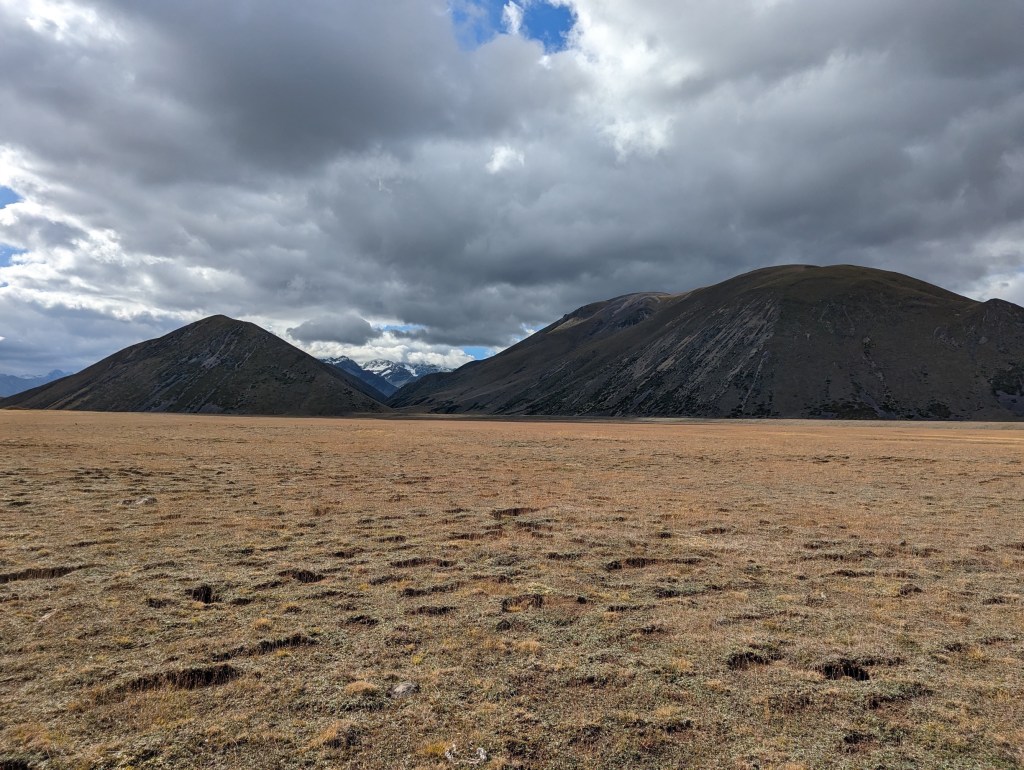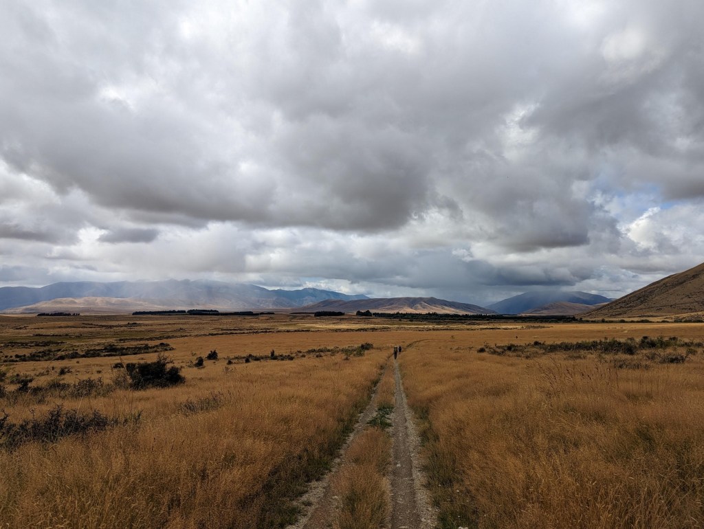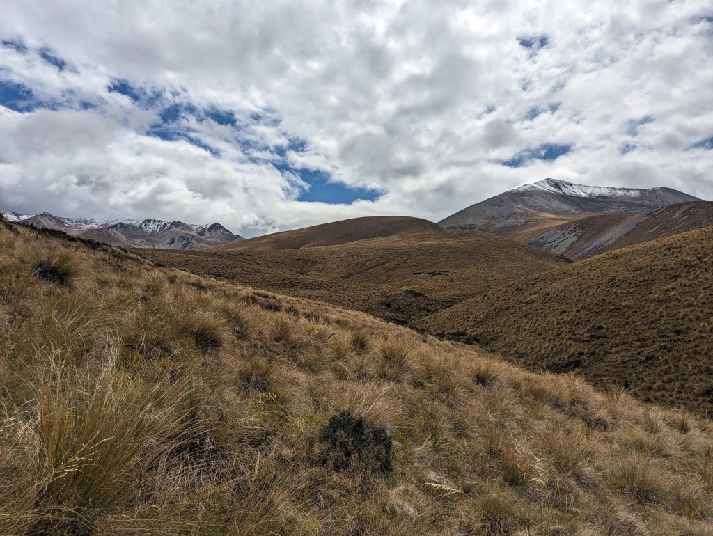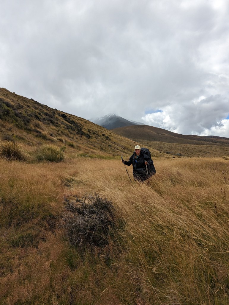 Une fois de l’autre côté de la forêt, le marquage officiel s’arrête et c’est à nous maintenant de nous débrouiller pour trouver notre route. Heureusement, le sentier est assez bien visible par le passage des gens mais il perd quand même en définition au fur et à mesure qu’on avance au point qu’on le perd parfois dans les hautes herbes. Pour pimenter la chose, alors qu’il quitte la forêt, un nuage gris nous passe dessus et ce n’est pas de la pluie qui nous tombe dessus mais des petits grêlons. C’est une première pour nous en NZ 😄 heureusement ça n’est qu’une affaire de quelques minutes.