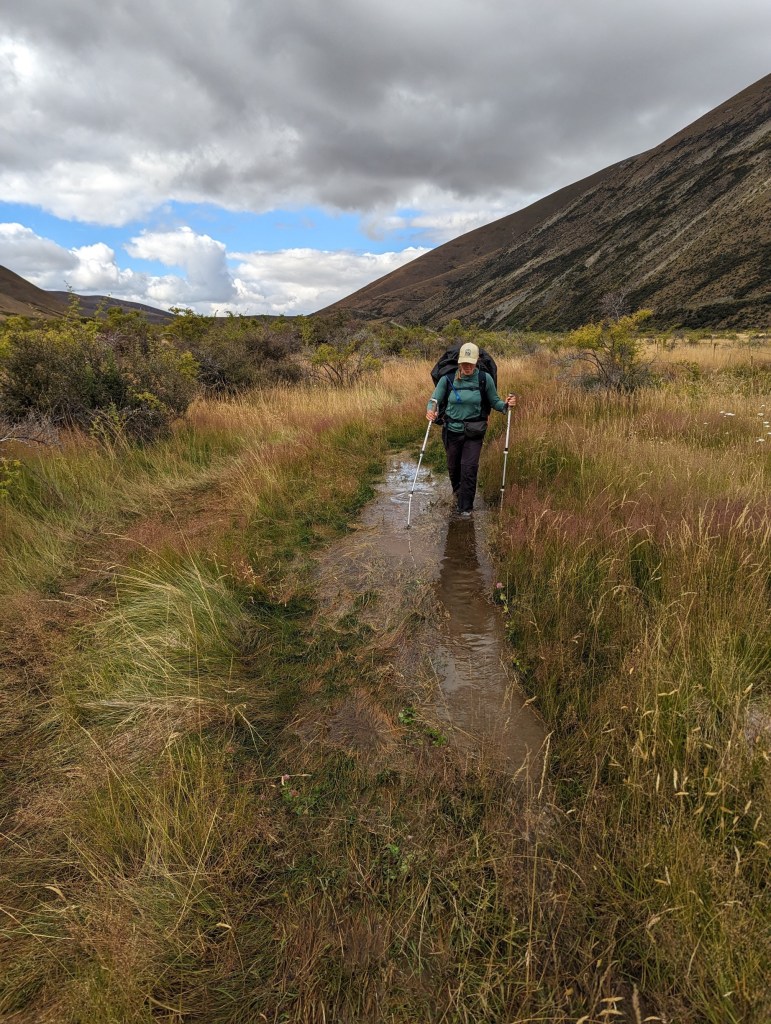 Pendant environ 1h30 on traverse ainsi de vastes espaces couverts de hautes herbes et autres buissons piquants mais aussi agrémentés par endroits de ruisseaux rendant le terrain marécageux. Inévitablement, nous pieds finissent par prendre un peu l’eau. Mais c’est surtout évidemment juste à la fin de ce détour au moment où on est sur le point de retrouver le sentier officiel du TA qu’on doit traverser une petite rivière dans laquelle on a pas le choix de mettre les pieds… Tout ça pour ça.