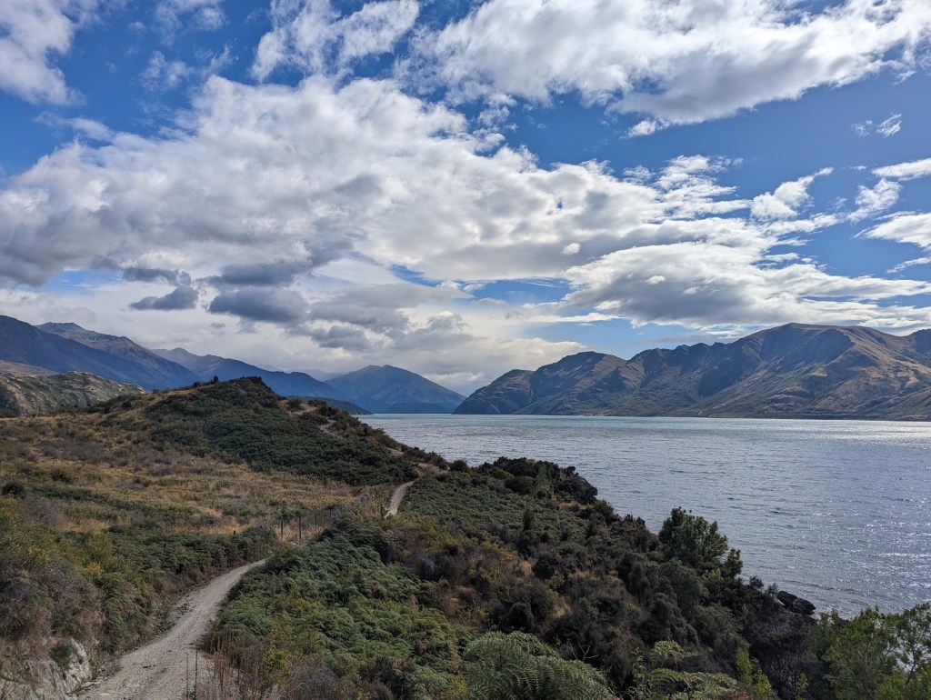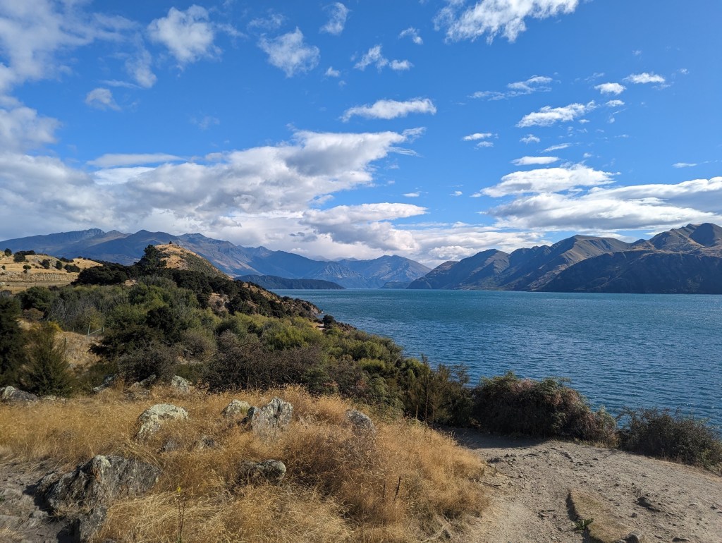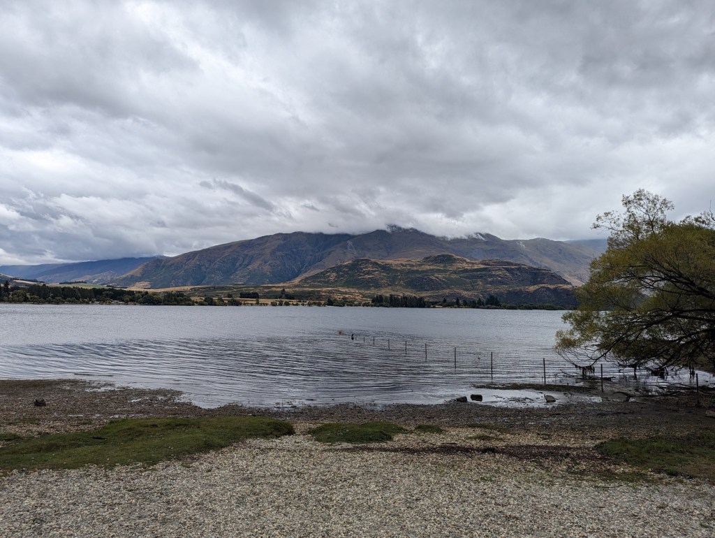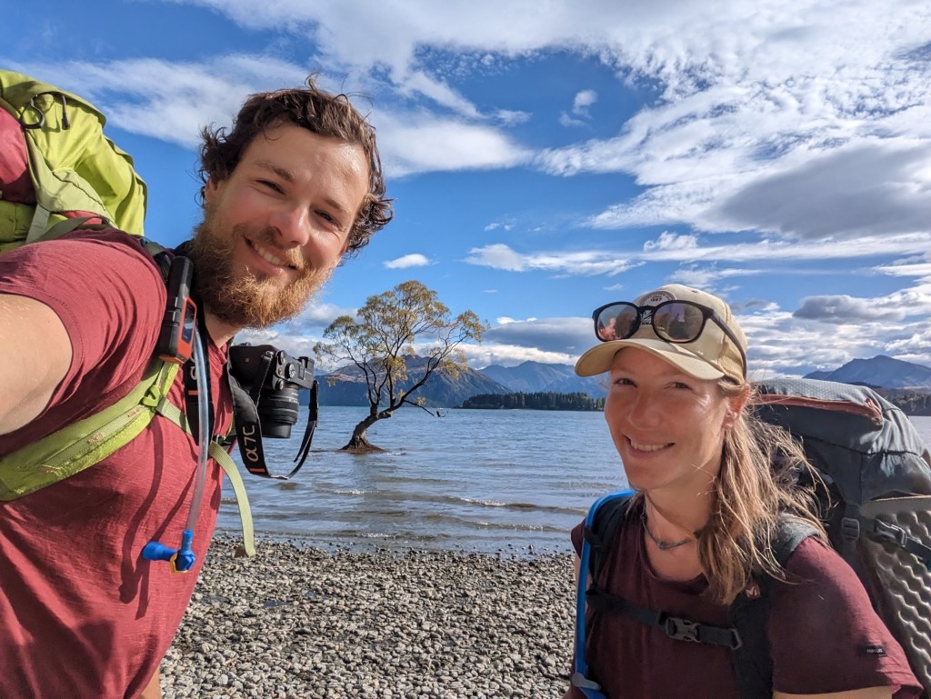 Always in the company of Gijs, today we begin a new 4-day section separating Wanaka and Queenstown following the Motatapu Track. And nothing better to start than to pass in front of the “famous” Wanaka Tree. It’s a lonely weeping willow in the water that made the buzz on social media a few years ago and has since been a popular spot with tourists 😅.