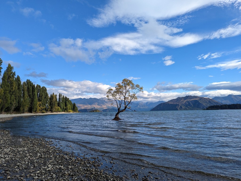 Toujours accompagnés par Gijs, on entame aujourd’hui une nouvelle section de 4 jours séparant Wanaka et Queenstown en suivant le Motatapu Track. Et rien de tel pour commencer que de passer devant le “fameux” Wanaka Tree. C’est un saule pleureur solitaire dans l’eau qui a fait le buzz sur les réseaux sociaux il y a quelques années et qui est depuis un lieu populaire avec les touristes 😅.