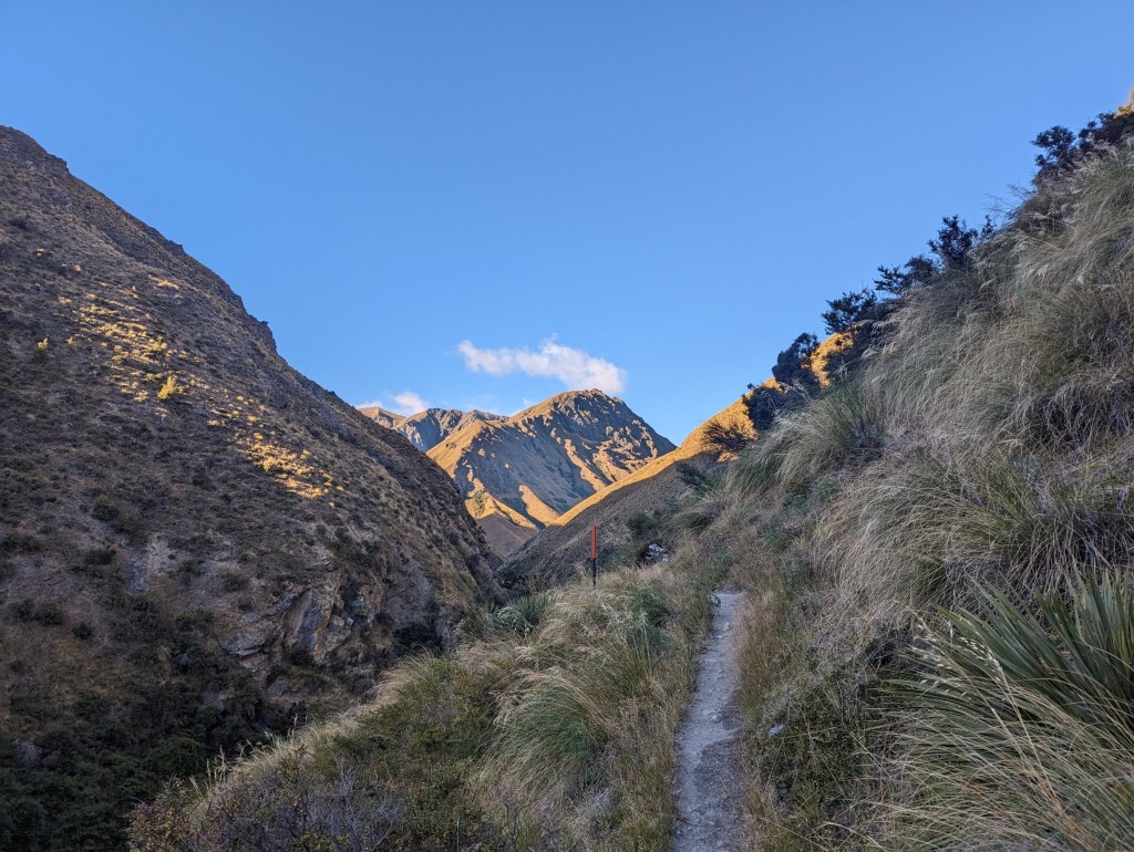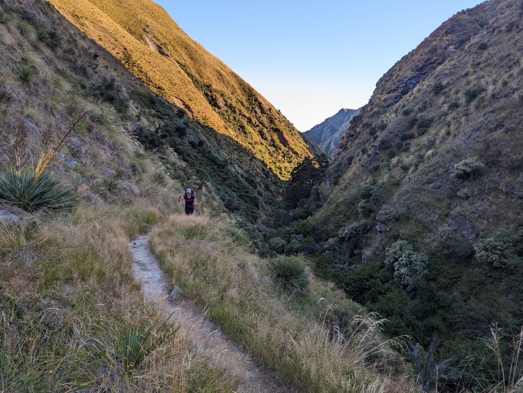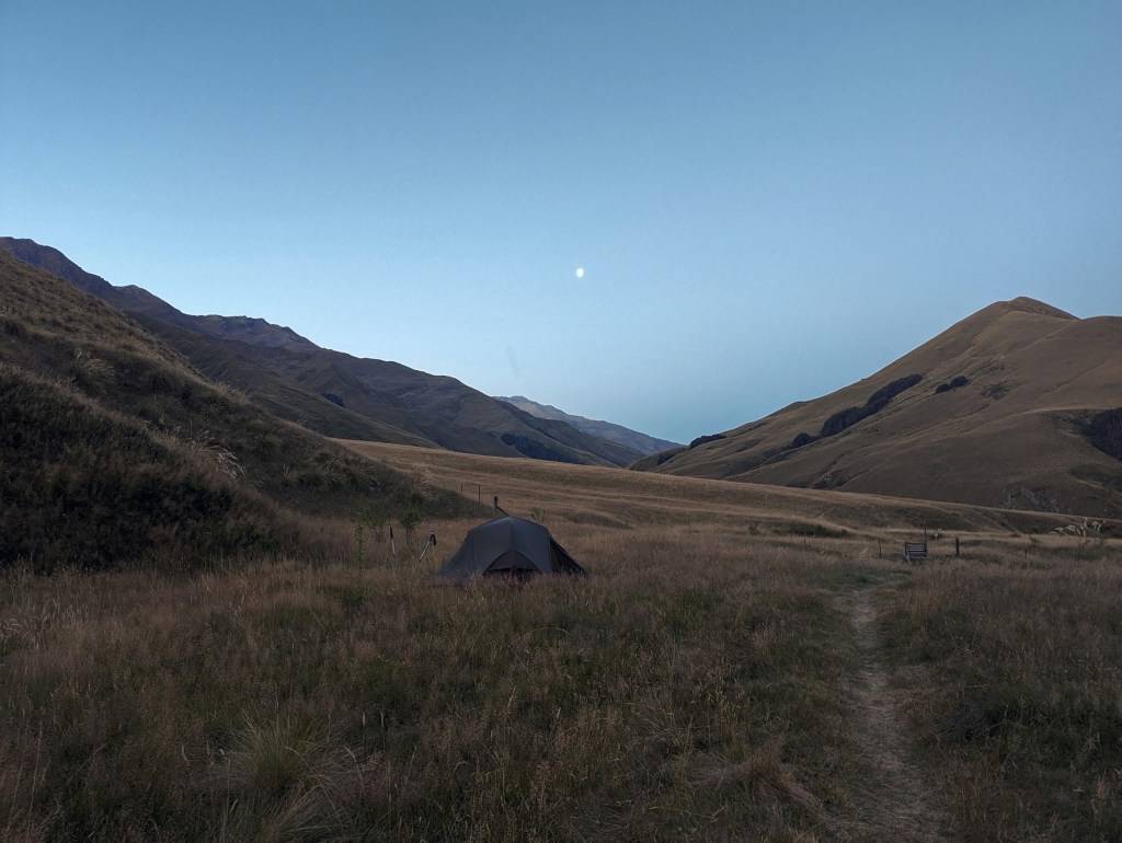 Pendant la descente, on voit la hut rapidement passer à l’ombre de la montagne avec le soleil qui disparait à l’horizon. Sur place, nous retrouvons Gijs dans sa tente à l’abri des sandflies qui pullulent comme souvent et dans la hut bien pleine il y a Max et Kat. Kat fête d’ailleurs aujourd’hui ses 30ans !