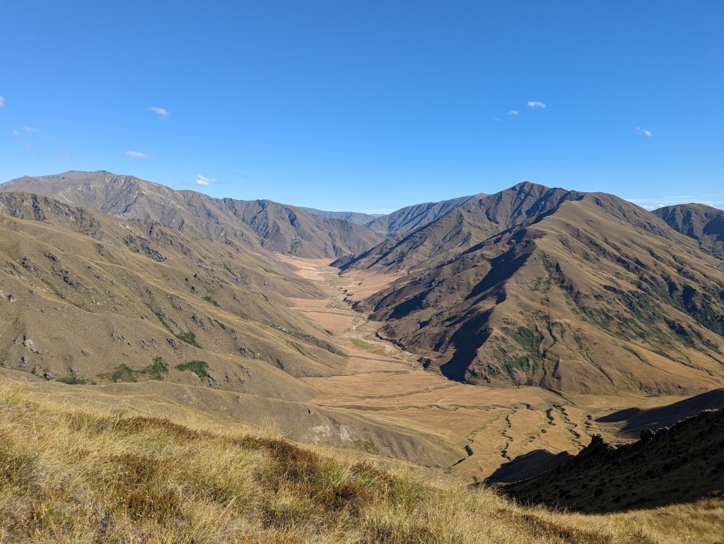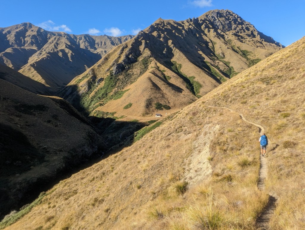 In one hour we reach the first hut: Fern Burn Hut. It is a very pretty hut in a valley now illuminated by the morning sun. It also marks the start of the first big climb of the day to a first pass beyond which is the second hut of the track – Highland Creek Hut – which we reach at around 12:30 p.m.