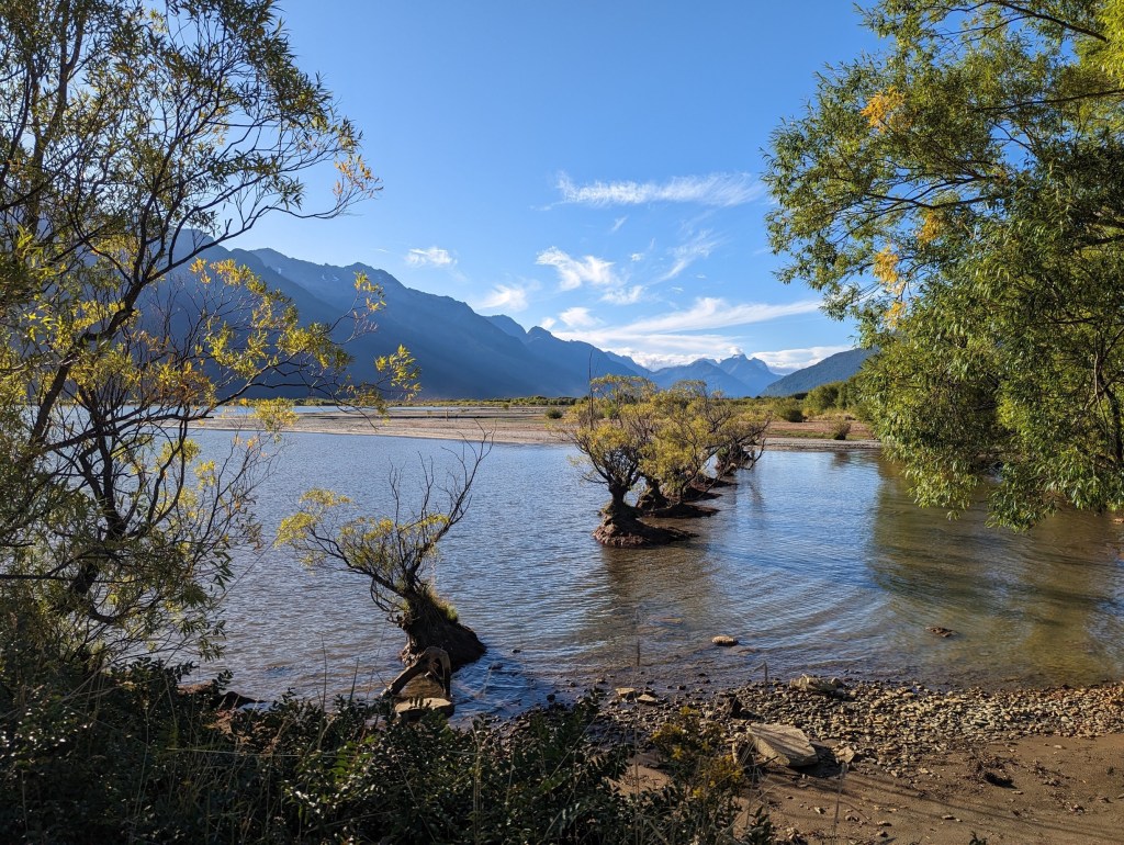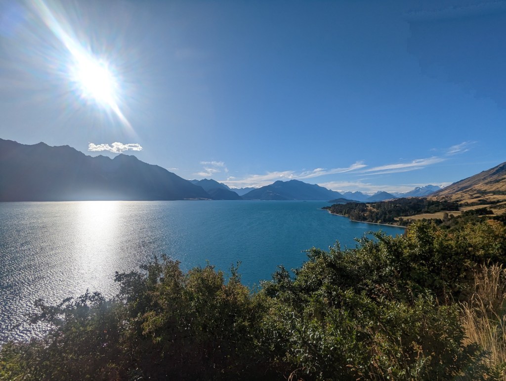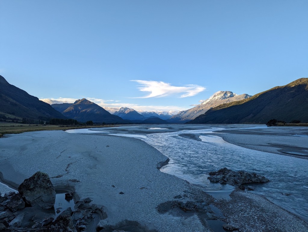 Notre but est idéalement d’arriver au point de départ du Routeburn, une des Great Walk qu’on veut marcher en un jour pour évider de payer le prix exorbitant des huts en chemin. Vu l’heure qu’il est, ça peut être difficile mais on veut quand même essayer et vu qu’on a nos tentes, on peut s’arrêter n’importe où 😁.