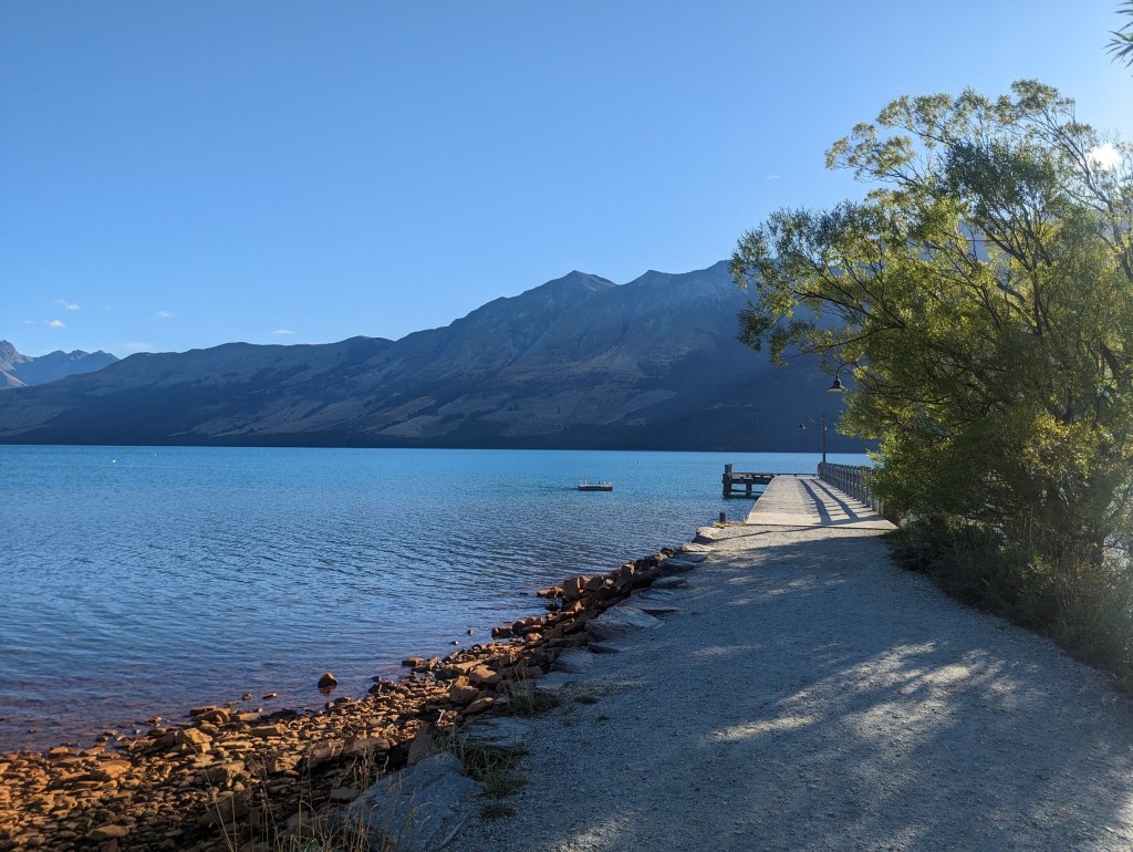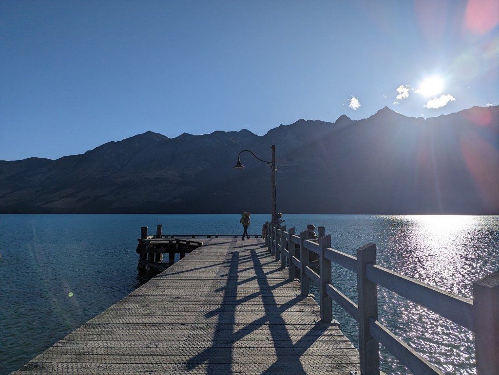 Une fois cela fait, on prend le bus pour retourner à Queenstown et pour y manger un lunch tardif. Mais je passe d’abord dans un magasin d’équipement de montagne pour y acheter de nouvelles pointes à ma bâtons de marche. La vendeuse est super sympa et me laisse même utiliser leur petit atelier pour les installer. Ça me sauve bien la mise 😅
