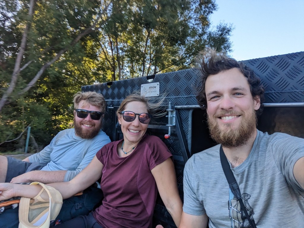 On est alors ramassé par 2 Kiwis qui se foutent de nous parce qu’il est tard et qu’ils pensent pas qu’on y arrivera mais ils nous embarquent à l’arrière de leur pick-up truck et nous avancent de 10km. Le pilote fait même un petit détour pour nous avancer autant qu’il peut.