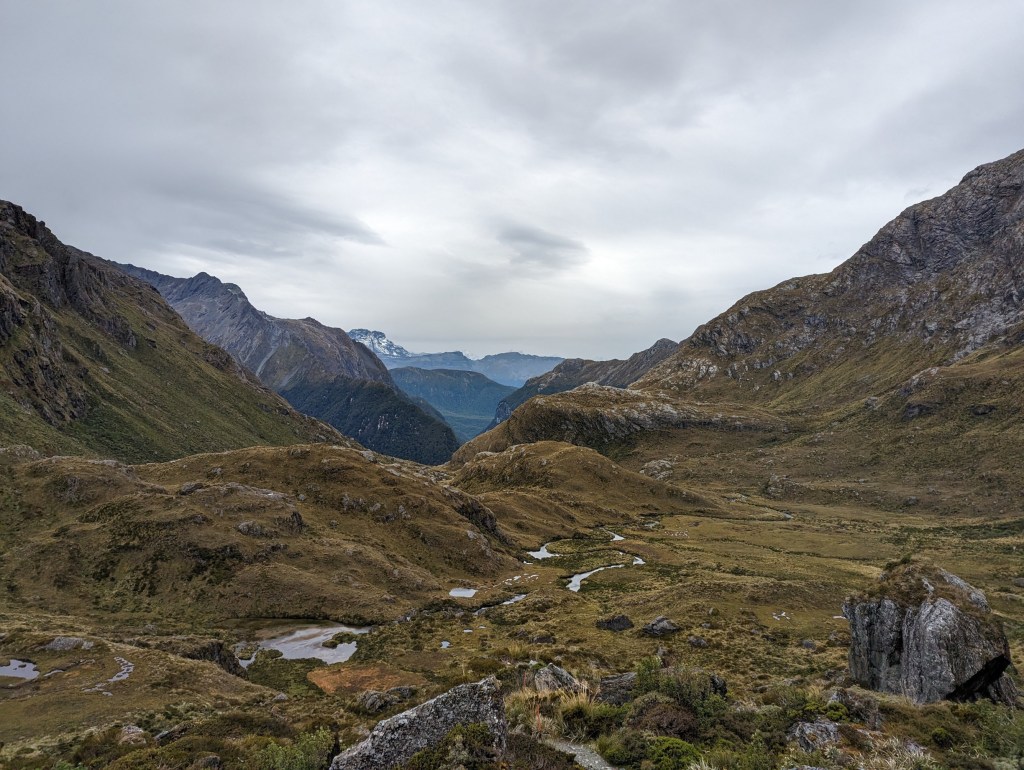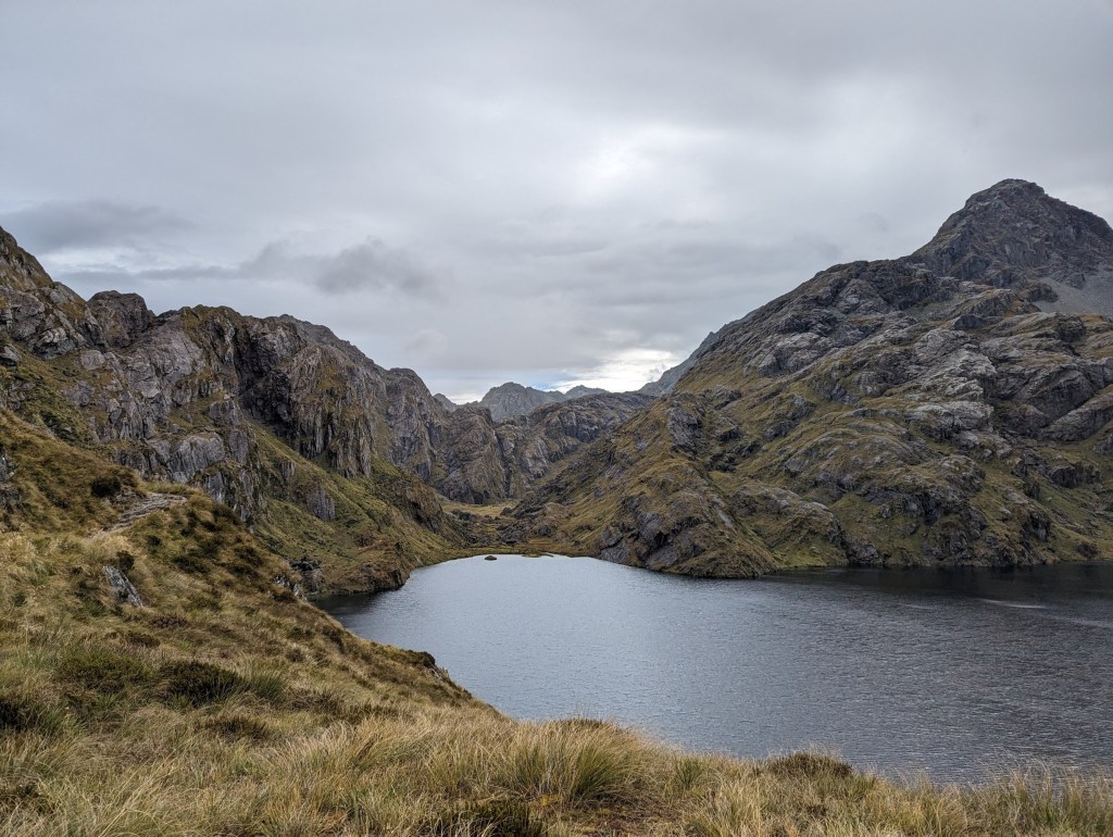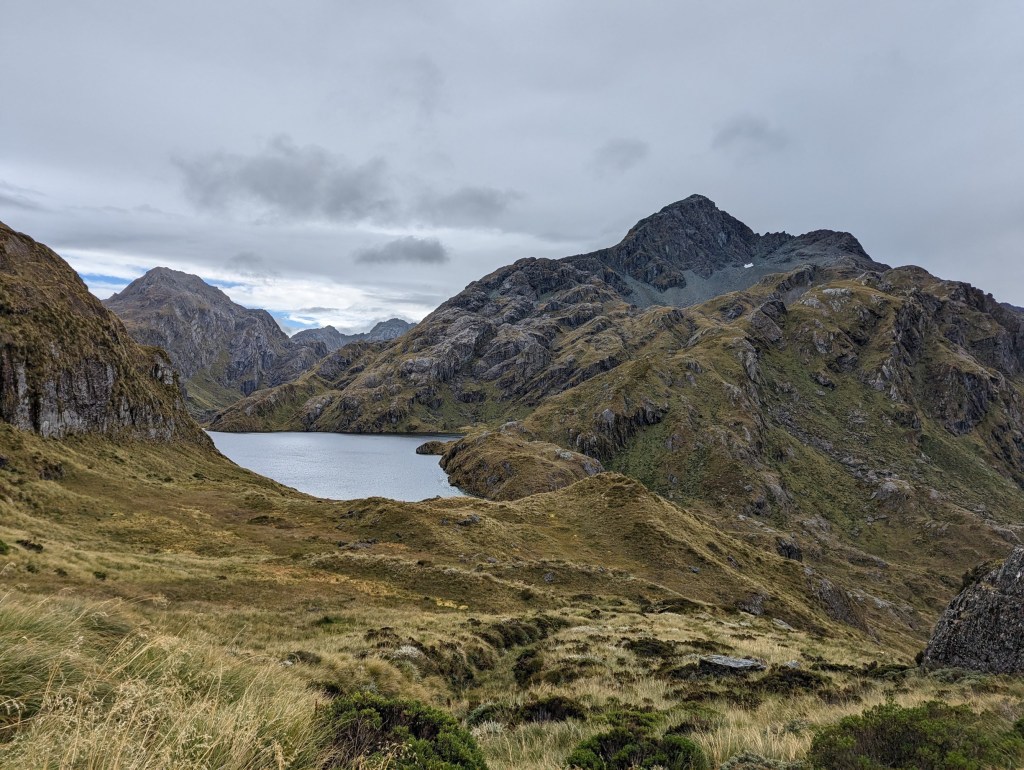 Le sentier continue de grimper gentiment jusqu’à une sorte d’amphithéatre rocheux dominant un superbe lac de montagne. Au col surplombant ce lac, nous prenons un bon petit lunch dans Harris Shelter d’où nous voyons et entendons de nombreux Keas au loin dans les falaises.