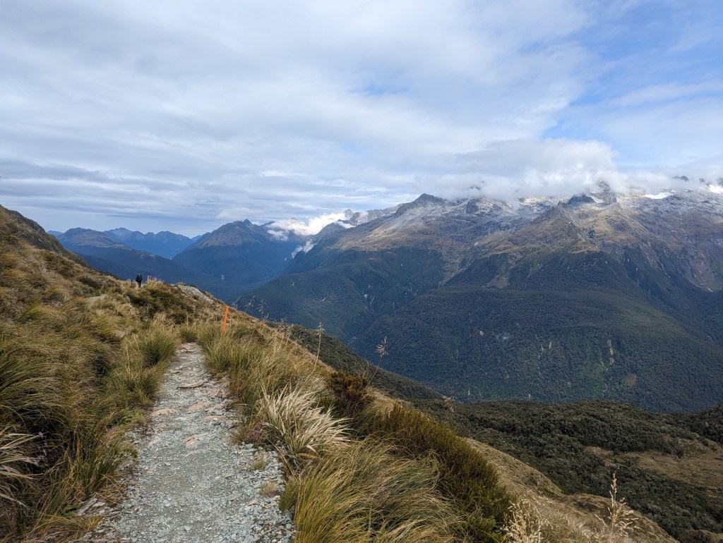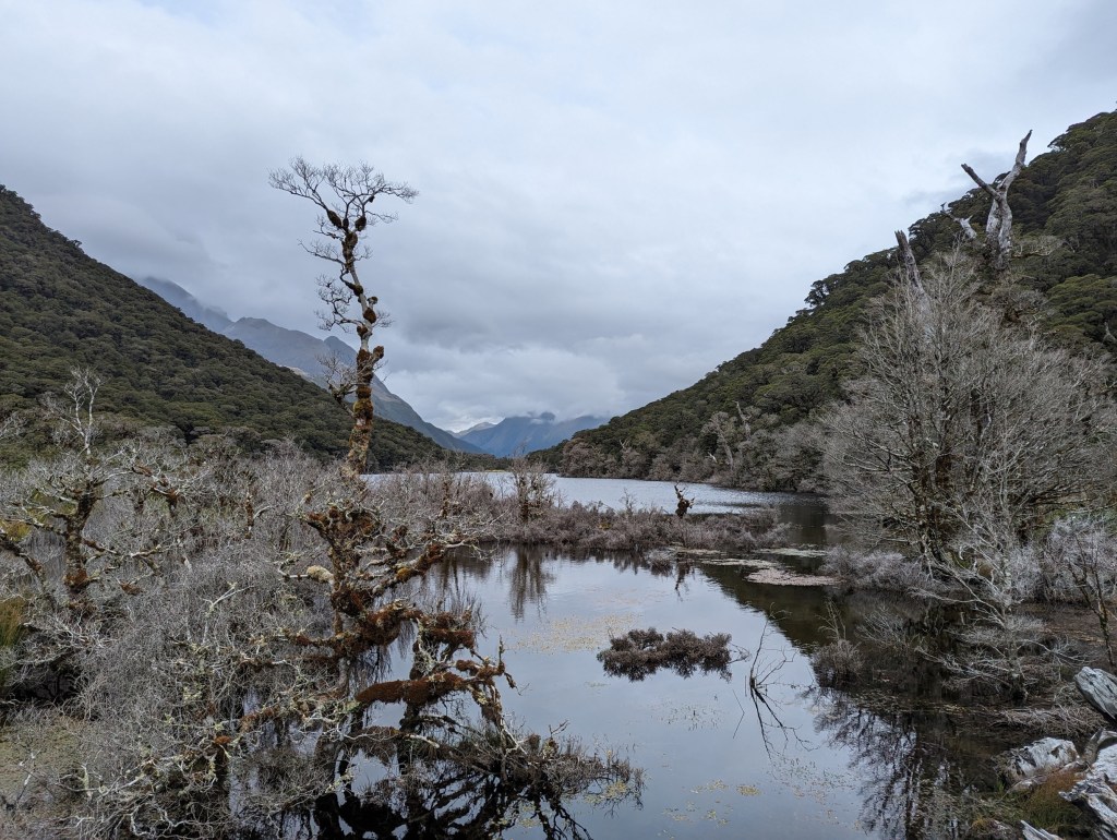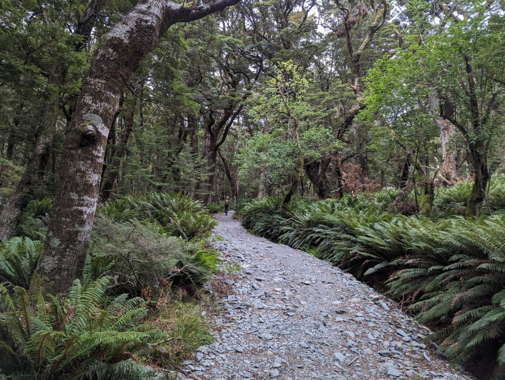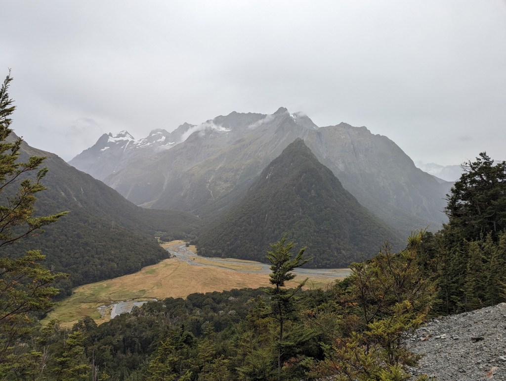 On quitte notre abri vers 8:00 sous un ciel couvert qui ne nous rend pas très optimiste pour la suite. Très vite, nous quittons le parking et entamons le fameux Routeburn Track! Il n’y a pas encore de nouveaux touristes alors nous sommes pour le moment seuls sur le sentier.