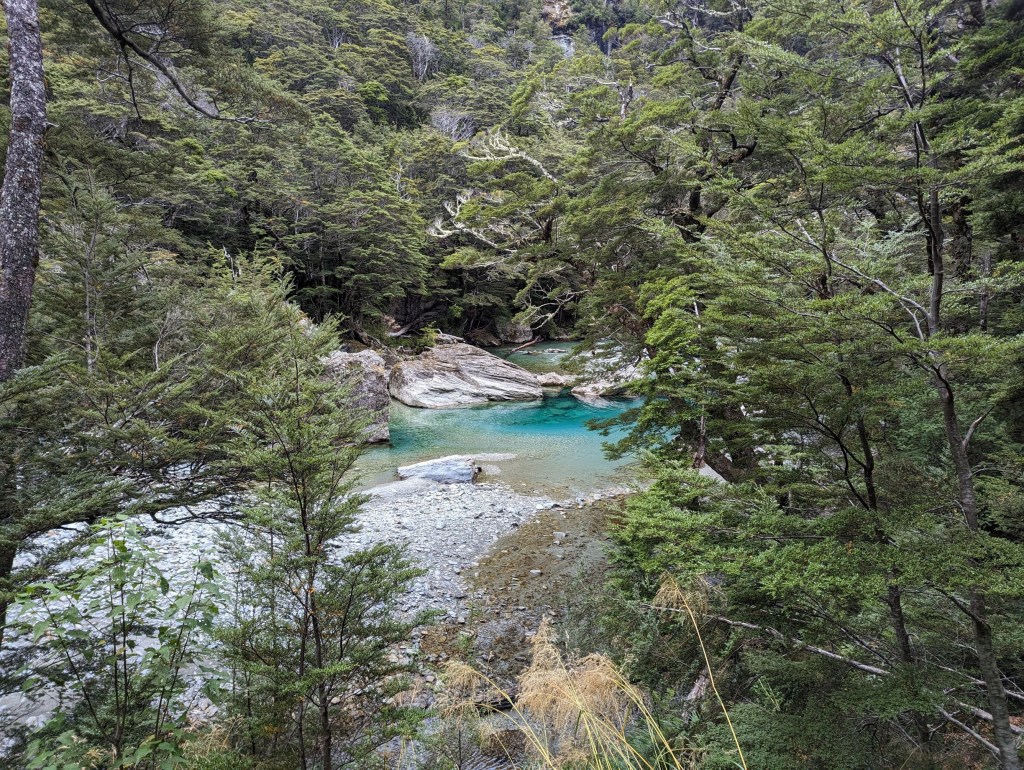 Celui-ci longe et remonte des gorges dans lesquelles coule une rivière d’un étonnant bleu électrique qui attire vraiment le regard parmi toute cette végétation sombre et verte.