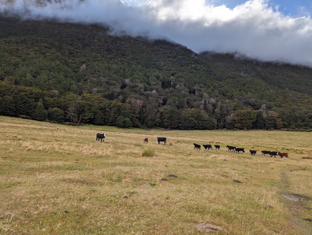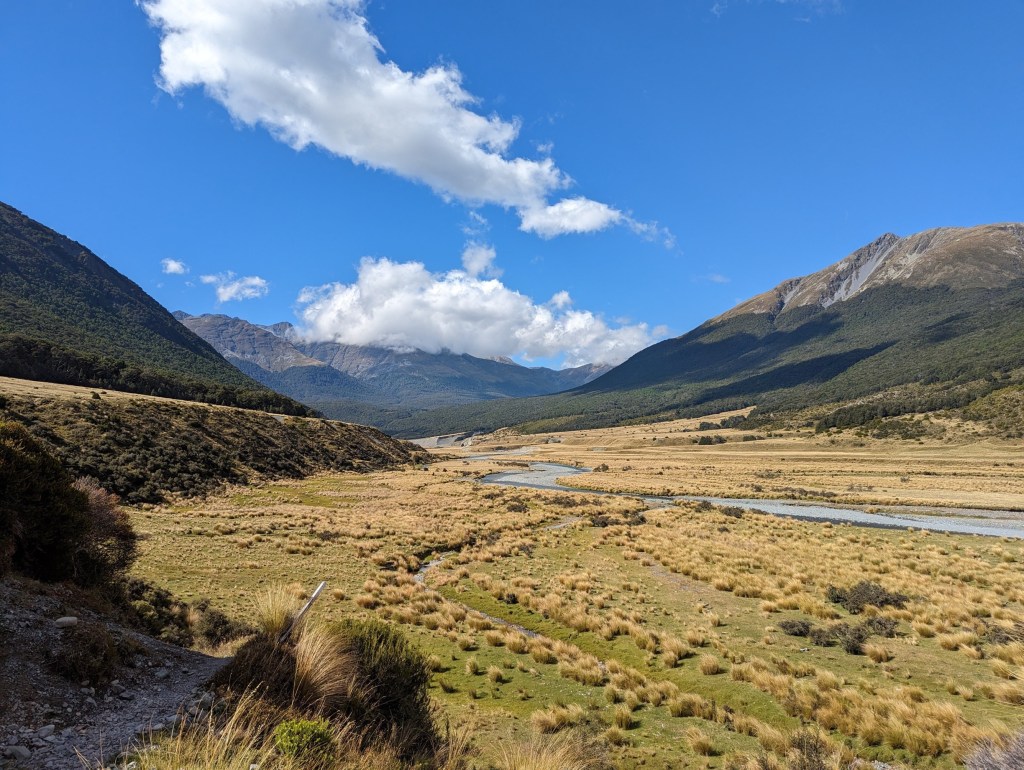 Départ tout en lenteur ce matin vers 8:40 😂. Mais nous n’avons que peu de kilomètres à parcourir et le chemin est très facile car plutôt plat au fond d’une large vallée. Nous marchons aussi finalement sous le soleil alors qu’il était annoncé de la pluie. On a encore un peu de chance 🙂