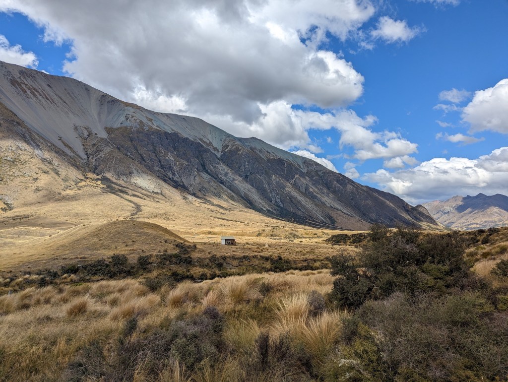 Nous arrivons finalement vers 15:45 à notre destination finale du jour : Careys Hut. Elle se trouve juste au bord du lac et on en profite alors pour s’y baigner malgré le petit vent frais qui souffle. La rive est affreusement vaseuse 😅 et à à peine 2m le fond disparaît ! Un peu surprenant quand on s’y attend pas haha