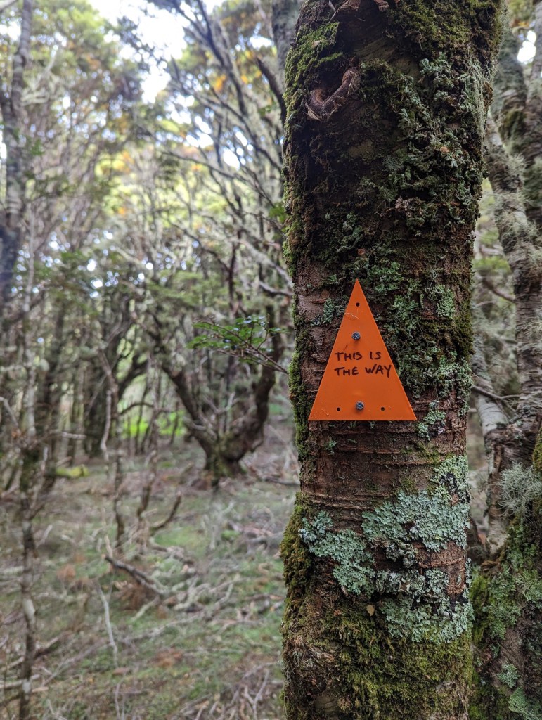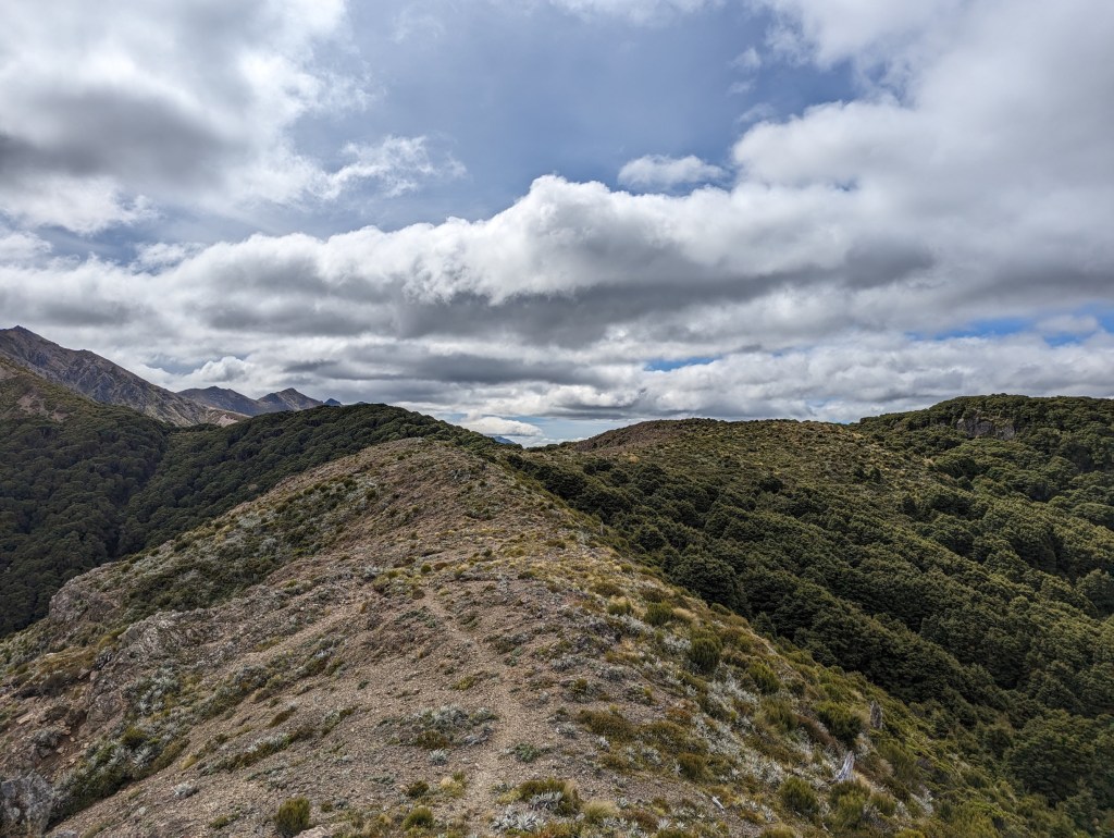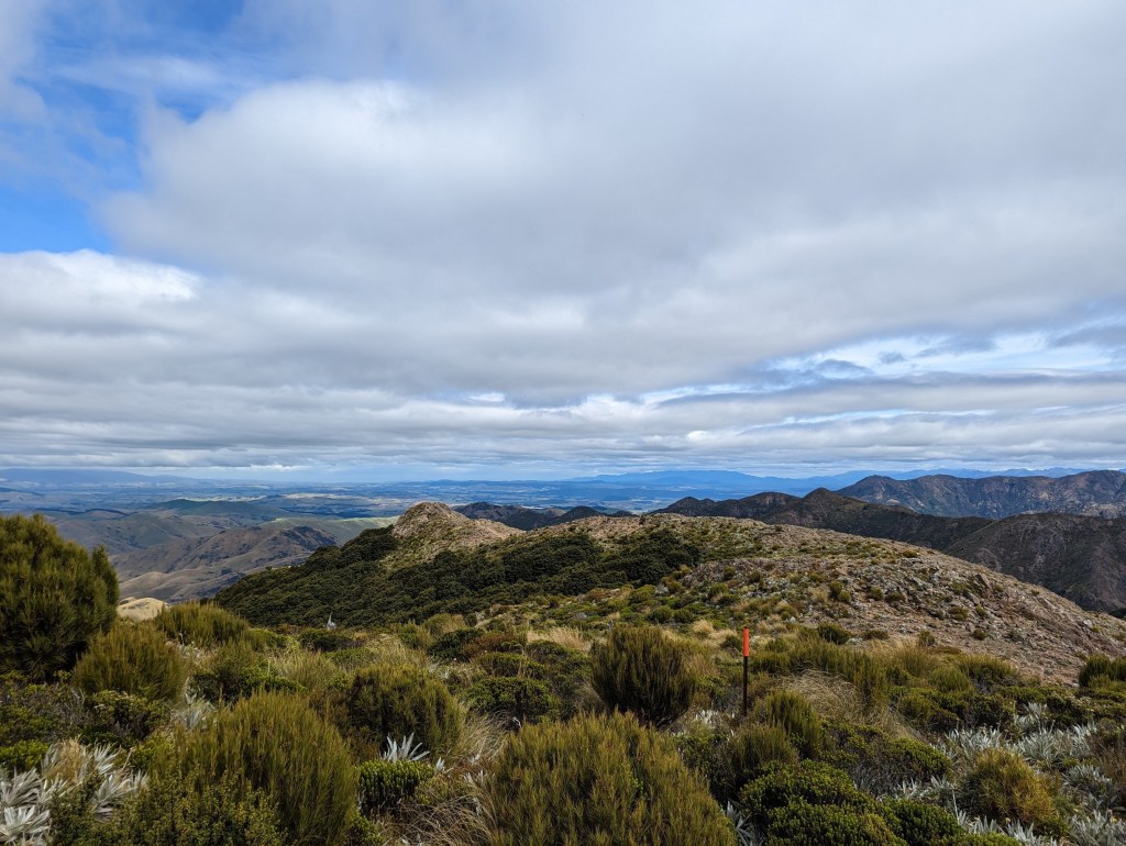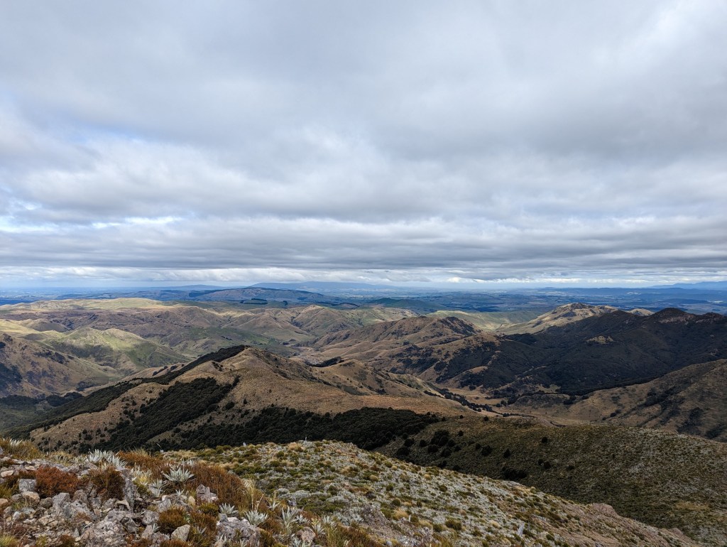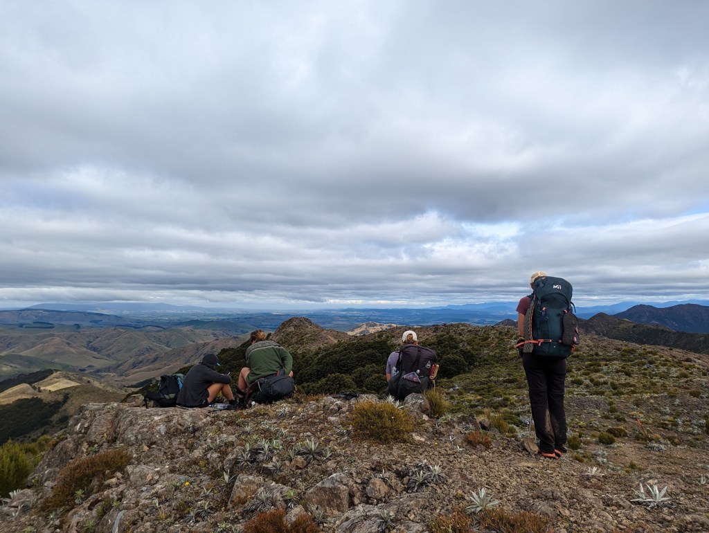 Après un lunch pour nous remonter le moral de cette défaite 😝 on entame une longue et pénible montée jusqu’à un sommet où, de façon un peu inattendue, le forêt s’arrête net et laisse place à un fantastique panorama donnant sur le sud. On peut d’ailleurs voir la côte sud de l’île et donc presque la ligne d’arrivée !!! Ça fait tellement bizarre de se dire qu’on a bientôt fini et qu’on a bientôt marché 3000km 🤯