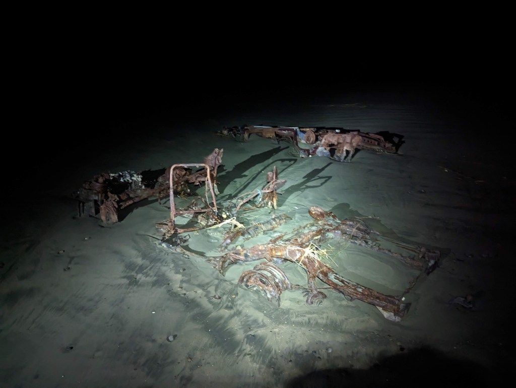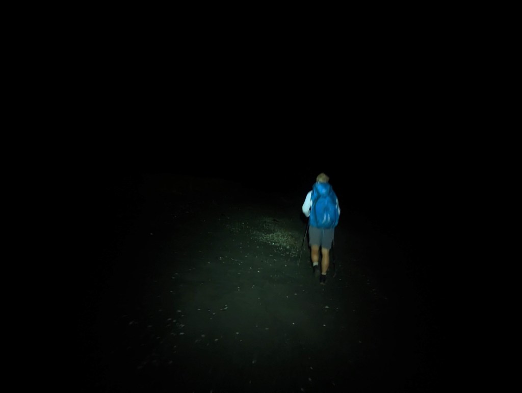 Once on the beach and away from Riverton, we walk in almost total darkness. It’s strangely relaxing for the mind. Especially since our headlamps on the lowest power mode only light 5m in front of us. Thus, the lines on the sand are the only changing reliefs that can be seen during these first hours. The dim light combined with the fatigue of waking up so early in the morning makes them hypnotizing to such an extent that they seem to come alive like big snakes under our feet.