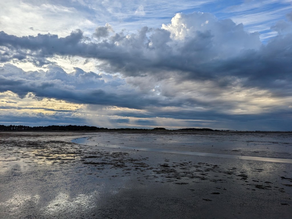C’est à ce moment-là qu’on comprend que les filles se sont plantées avec les horaires des marées car, pour nous, l’eau dépasse à peine nos chevilles 😂. Étant donné l’énorme distance qu’il nous reste à parcourir, nous décidons de prendre le temps d’enlever nos chaussures pour les garder sèches le reste de la journée. En plus, c’est une bonne opportunité pour prendre notre première pause…
