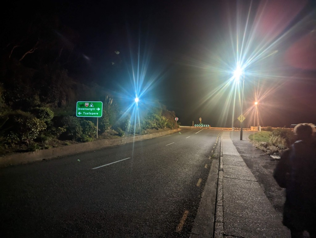 Nous terminons les 8 derniers kilomètres de plage en voyant les premières lueurs de l’aube monter progressivement en intensité et nous arrivons enfin à 6:40 à la route menant à Invercargill. Le premier tiers du challenge (24km) est fait.
