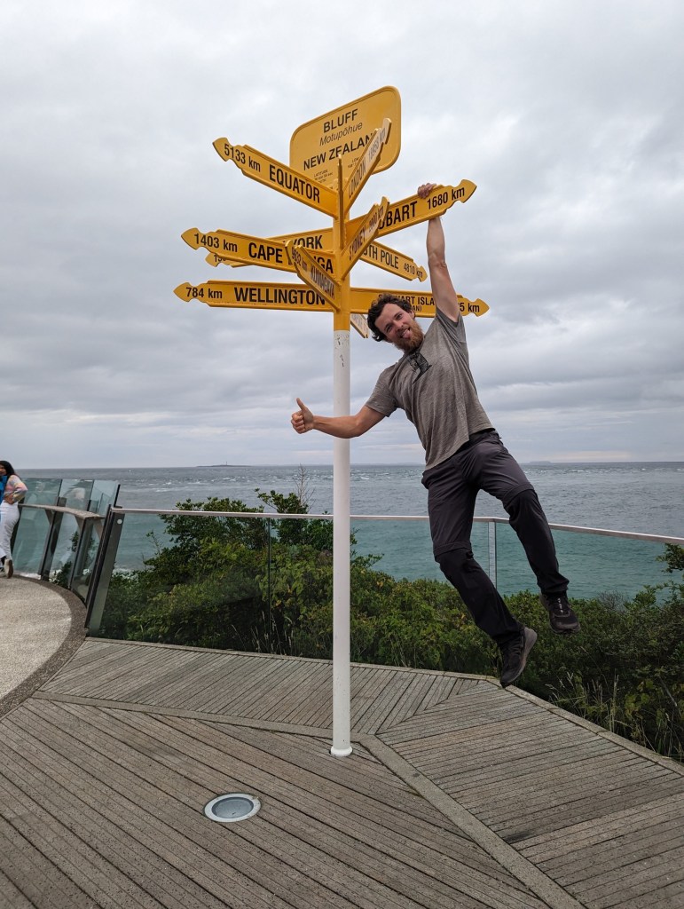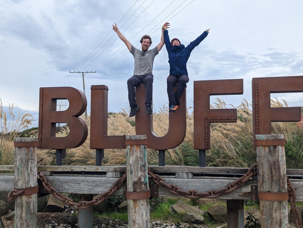 Around 2:45 p.m. we arrive at the Bluff entrance sign. This also marks the end of the road section! Finally ! We take some pictures there to celebrate. Nathalie decides to continue alone while I stay here to wait for Raphaël, Gijs and the group with whom I stayed the night before at the hotel.