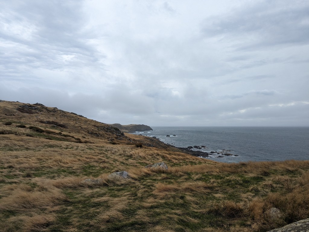Alors que nous marchons le long de notre raccourci, une voiture s’arrête et un couple de Kiwis nous propose de nous amener directement à Bluff. On refuse avec regret en expliquant notre plan…