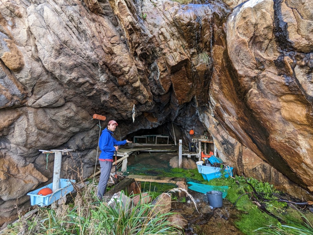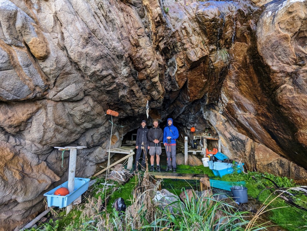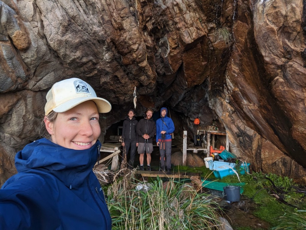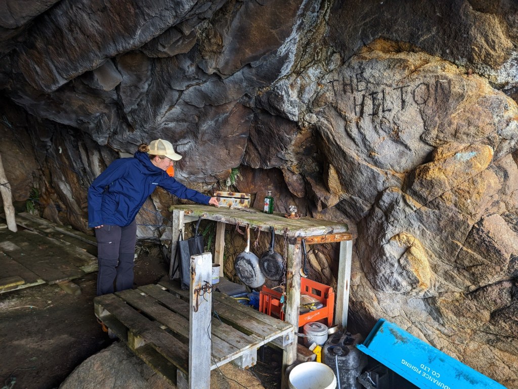 L’aménagement paraît étonnamment confortable (pour une grotte) avec un sommier en filet de pêche, un établi en bois et un rond de pierre pour un feu. La vue y est aussi magnifique depuis l’intérieur. C’est par contre très humide avec de l’eau qui coule non-stop du toit juste à l’entrée 😅. Sur un mur on peut voir que le lieu a été fièrement nommé : The Hilton 😂.
