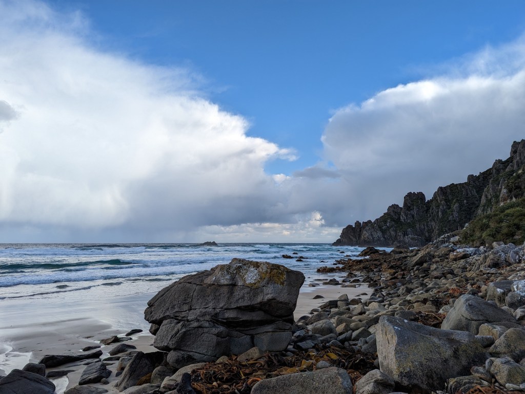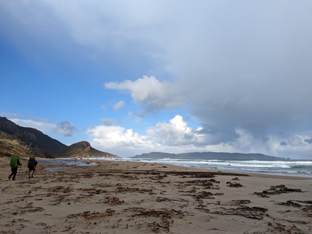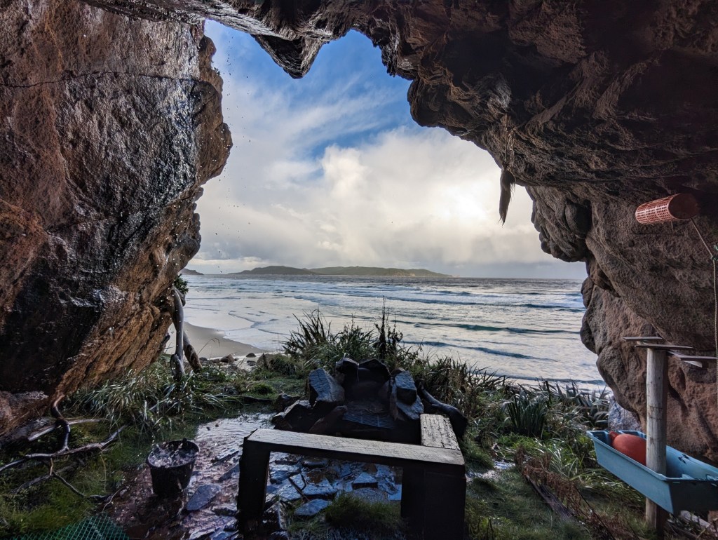 Après une brève traversée de forêt, nous nous retrouvons sur West Ruggedy Beach. De là, il nous a été recommandé par les randonneurs croisés précédemment de faire un petit détour pour aller voir une petite grotte aménagée comme bivouac.