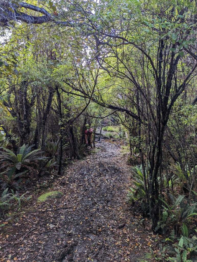 Et c’est là que, vers 10:25, juste après un tournant alors qu’on s’y attendait vraiment pas, nous tombons sur notre premier kiwi sauvage du voyage !!! Il grattait le sol pour manger, au milieu du sentier. Dès qu’il nous voit, il file dans les buissons alors qu’on s’arrête net sur nos pas mais il ne va pas trop loin ce qui donne une chance à presque tout notre groupe de le voir 😊 (sorry Anne). Après les Kiwi fruits et le Kiwi humans, on aura enfin réussi à voir tous les types de Kiwis 😄.