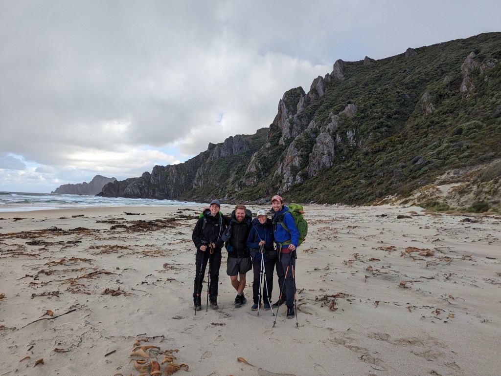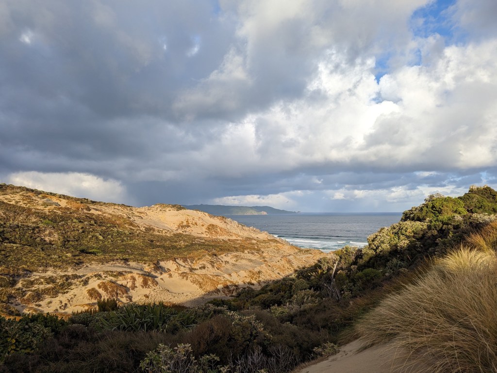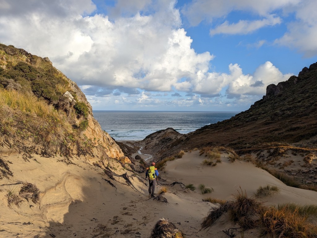 On arrive finalement vers 15:20 à Big Hellfire Hut qui se trouve en haut d’une colline avec une magnifique vue sur Ruggedy Flat en contrebas qui est un vaste bassin plat et marécageux. Juste avant la hut il y a aussi une étonnante dune de sable qui monte d’une plage plus bas jusqu’à la hut 250m plus haut. C’est assez fou.