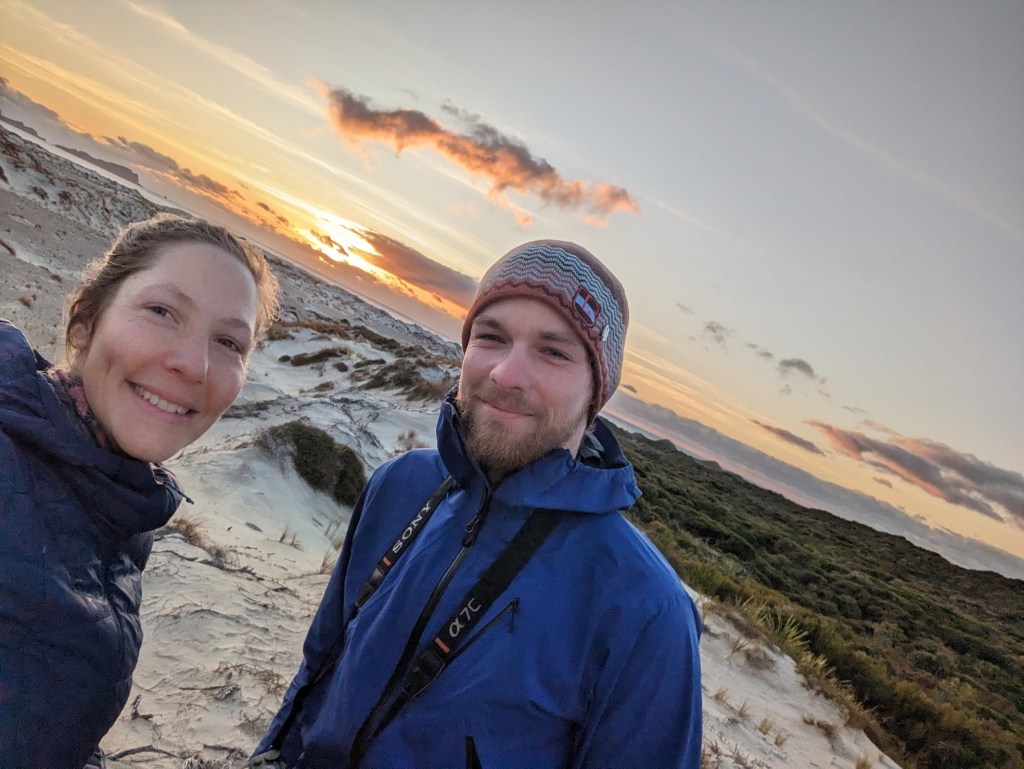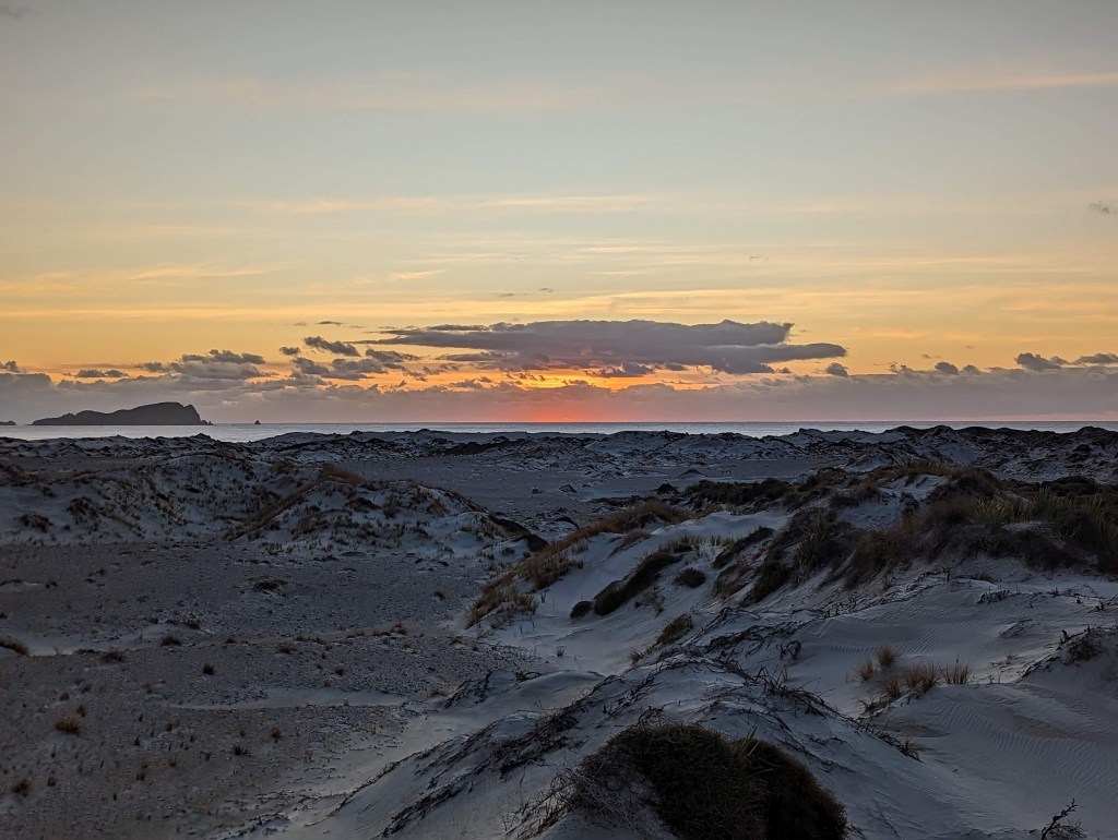 Au coucher du soleil, on se rend au sommet d’une dune à côté de la hut pour l’admirer pendant une bonne demi-heure. Une fois le soleil couché et la nuit tombée, on ressort faire une dernière tentative pour aller voir des kiwis car il paraît qu’un grand nombre de kiwis nés en captivité sont relâchés ici. Mais c’est malheureusement un échec 🙁.