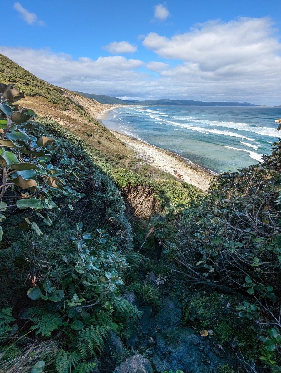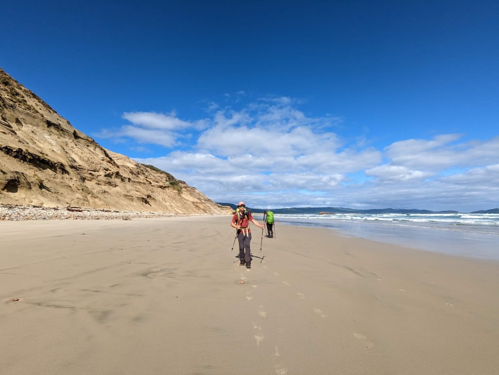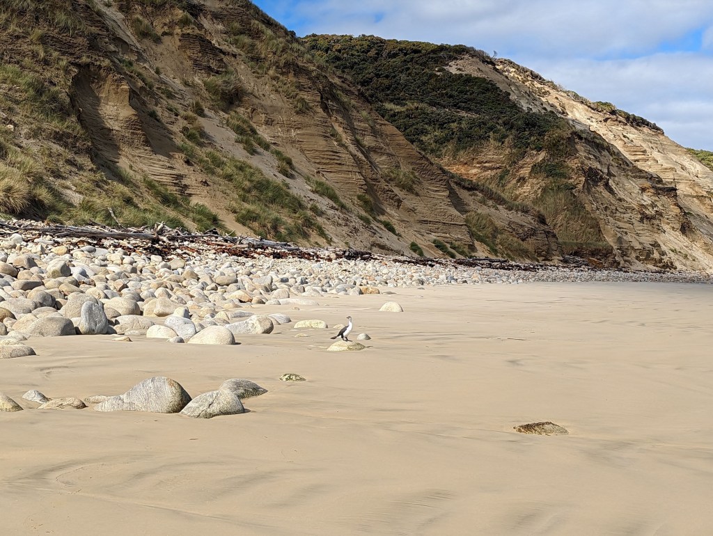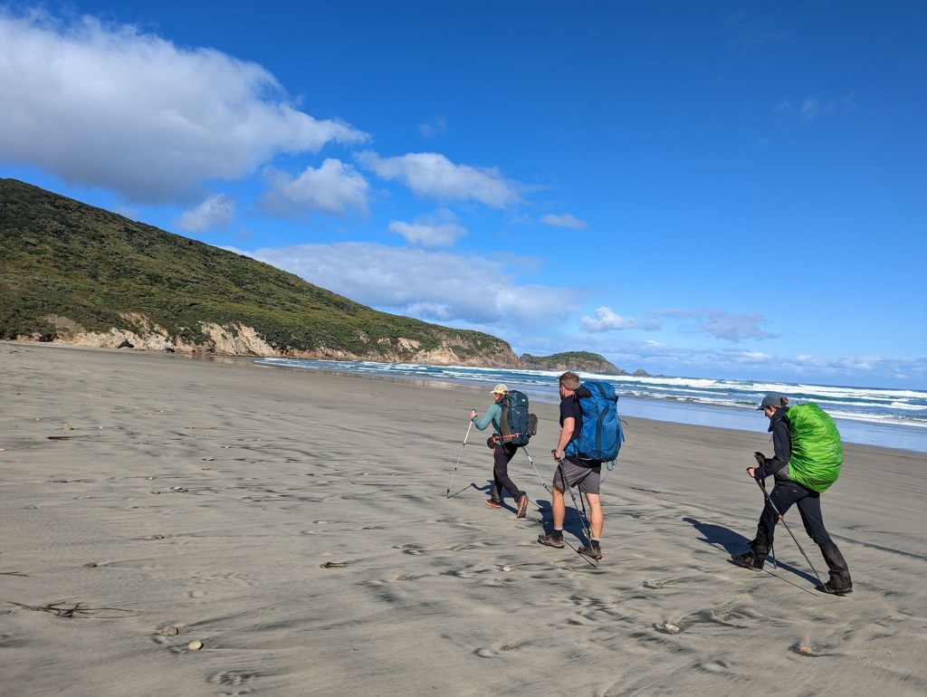 Le chemin descend ensuite vers une première plage où on trouve une petite hut qu’on atteint vers 11:15 et dans laquelle on décide de prendre un early lunch pour être à l’abri des sandflies. Dans cette hut, on trouve un groupe de 5 vieux chasseurs trop marrants avec qui on tape la causette pendant qu’on mange. Au moment de partir, ils nous offrent un paquet de bonbons 😄.