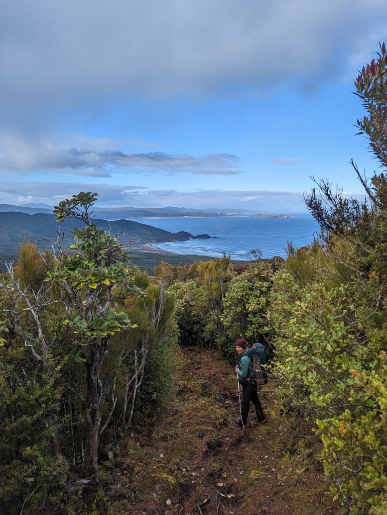 8:30 on brave le froid matinal et on se lance sur l’arrête couverte de forêt qui nous reste à parcourir. C’est là, après 1h de marche, qu’on croise notre quatrième kiwi !! 😍 C’est Mag’ qui menait la marche cette fois et qui a pu le voir la première au milieu du chemin 😊.