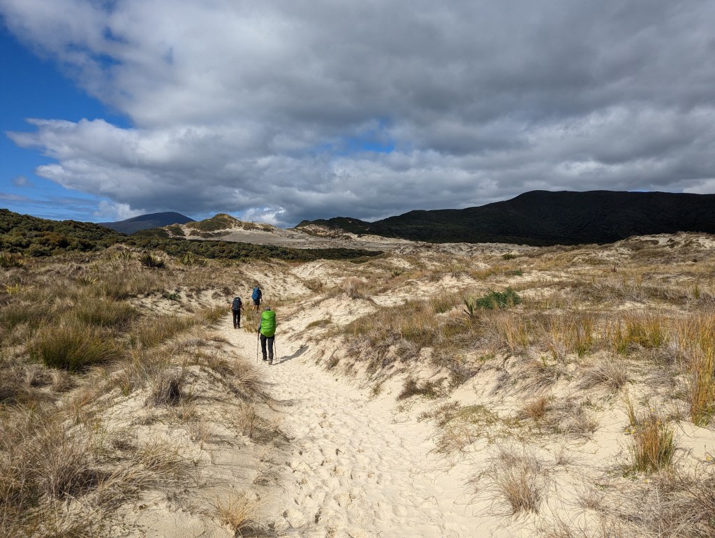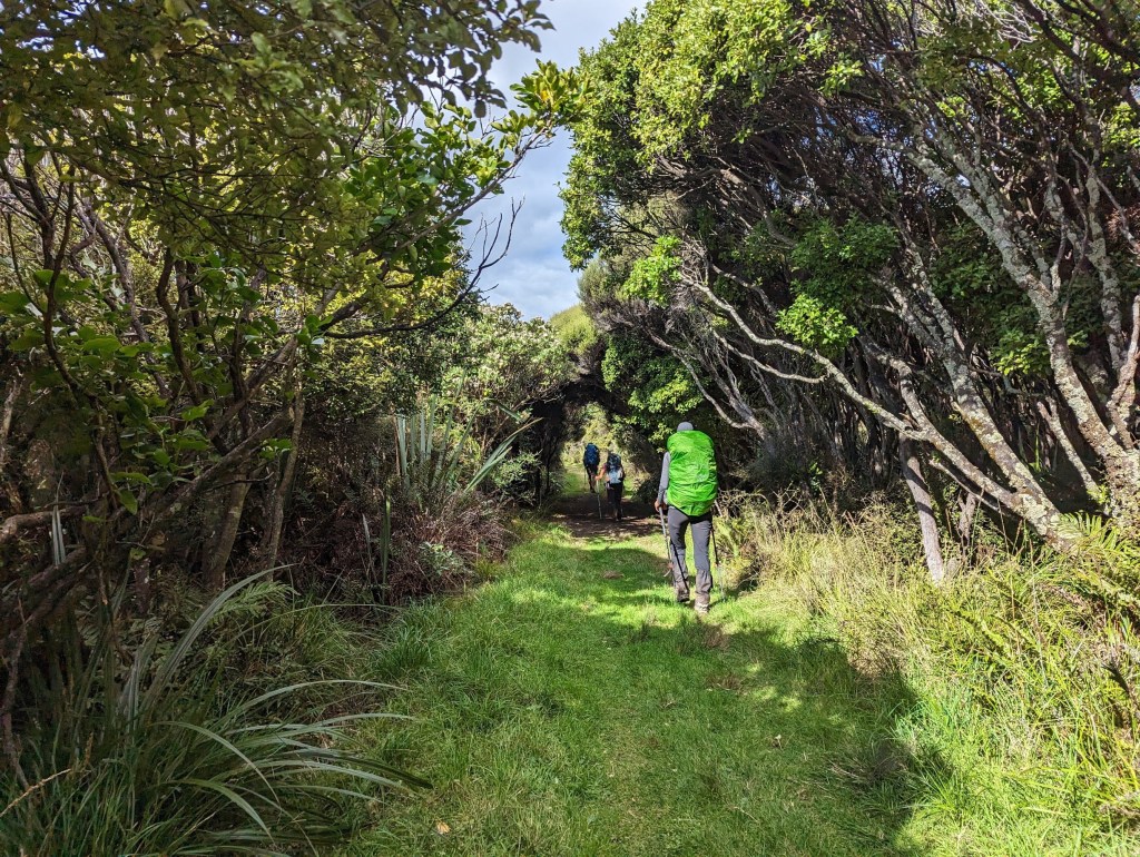 The path then descends towards a first beach where we find a small hut which we reach at around 11:15 and in which we decide to have an early lunch to be safe from the sandflies. In this hut, we find a group of 5 funny old hunters with whom we chat while we eat. Right as we’re leaving, they offer us a pack of candies 😄.