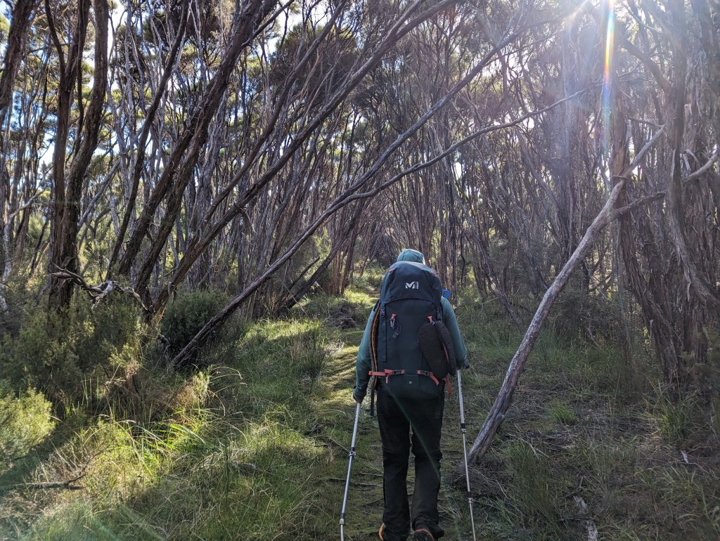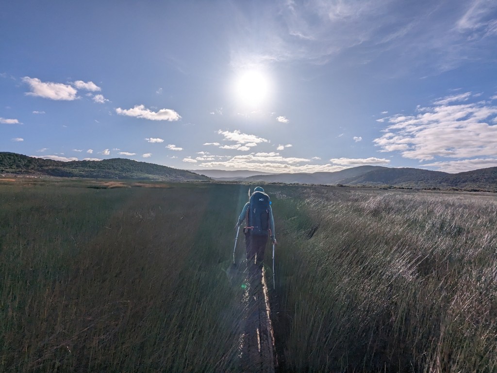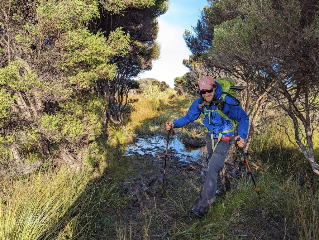 Le chemin d’aujourd’hui traverse la grande plaine marécageuse au milieu de l’île. Heureusement, la majeure partie du sentier a été couvert de planches pour éviter qu’on ne s’enfonce dans la boue. Mais ça n’est malheureusement pas un plan sans failles car par moment les planches elles-mêmes sont sous l’eau 😅. On comprend maintenant pourquoi il y a des panneaux annonçant que le chemin peut être impraticable en cas de grosse pluie.