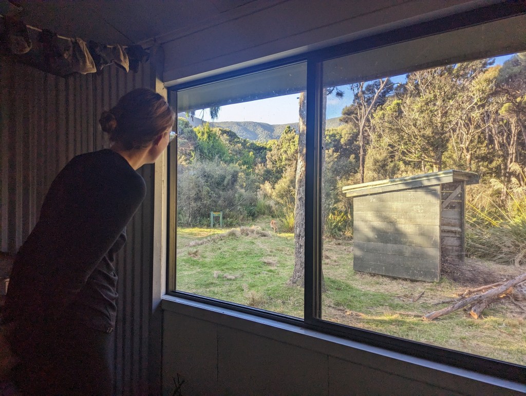 Later in the evening, we hear some noises outside and we discover that a young deer is prowling around the hut. Lucky for her we’re not hunters 😅…