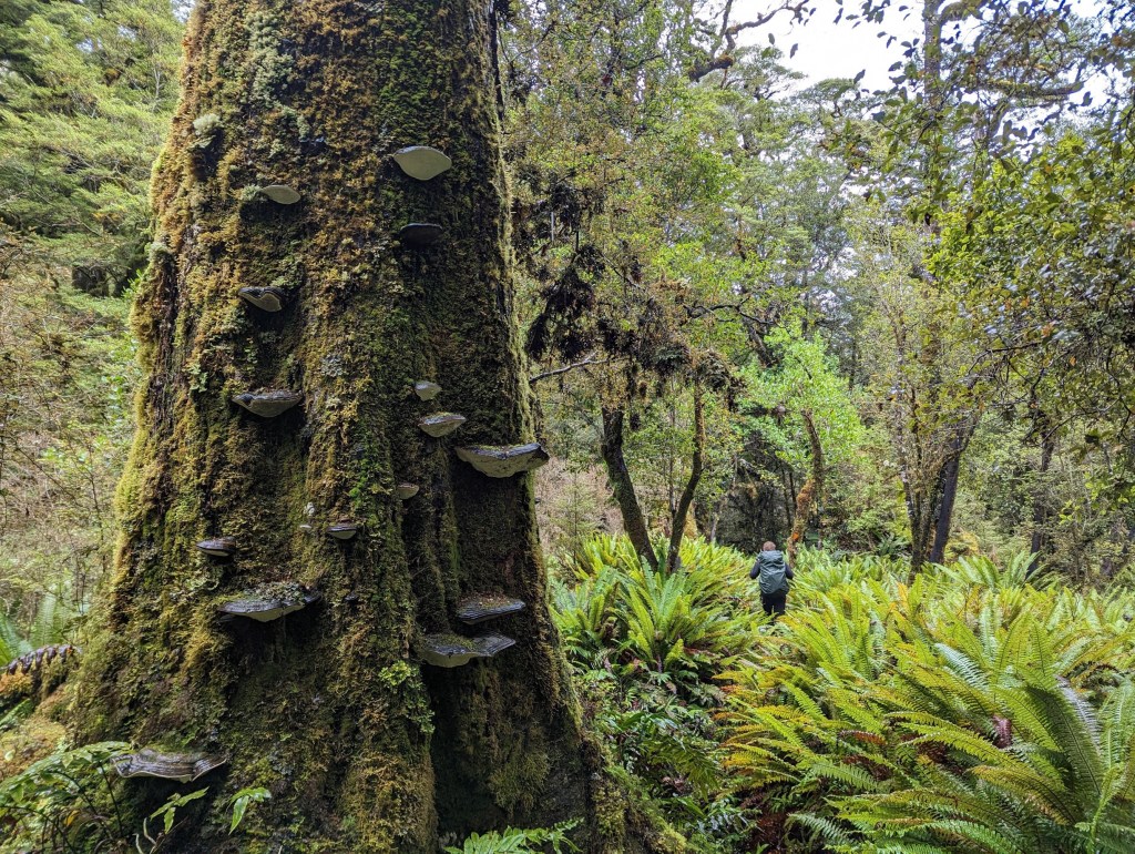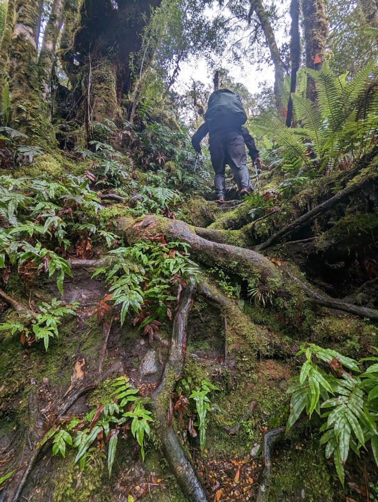 On voit tout de suite le passage du DOC. Ils ont débroussaillé les fougères le long du sentier. Ça rend d’autant plus facile ce premier tronçon très plat. On a un bon rythme et les pieds quand même rapidement mouillés 😅. À à peine quelques centaines de mètres on aperçoit du coin de l’œil une biche qui file dans la forêt. Puis très vite après, c’est un kereru qui s’envole à côté de nous ! On tombe aussi tout à coup sur un petit groupe de trois chasseurs, un père et ses deux fils. Ils se rendent aussi à la même hut que nous mais en prenant plus leur temps car ils cherchent à tirer un cerf.