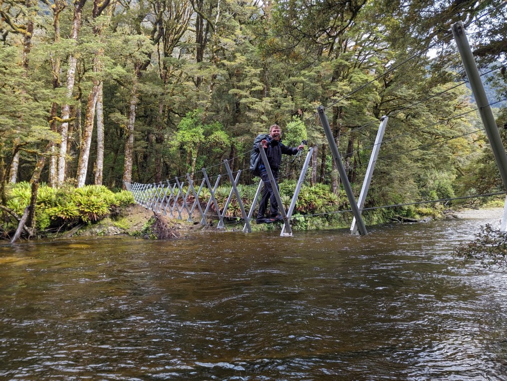 Il faut 40 minutes avec les moteurs à fond pour arriver à notre destination à l’extrémité nord ouest du lac où se trouve une première hut, Hauroko Burn Hut. Sur place, on tombe sur une équipe du DOC qui semble terminer une mission d’entretien du trail. Tant mieux pour nous ! Malheureusement ils nous annoncent rapidement que le premier pont de câbles n’est pas utilisable qu’on va devoir traverser la rivière… Au moins c’est sur, on aura pas les pieds secs aujourd’hui.
